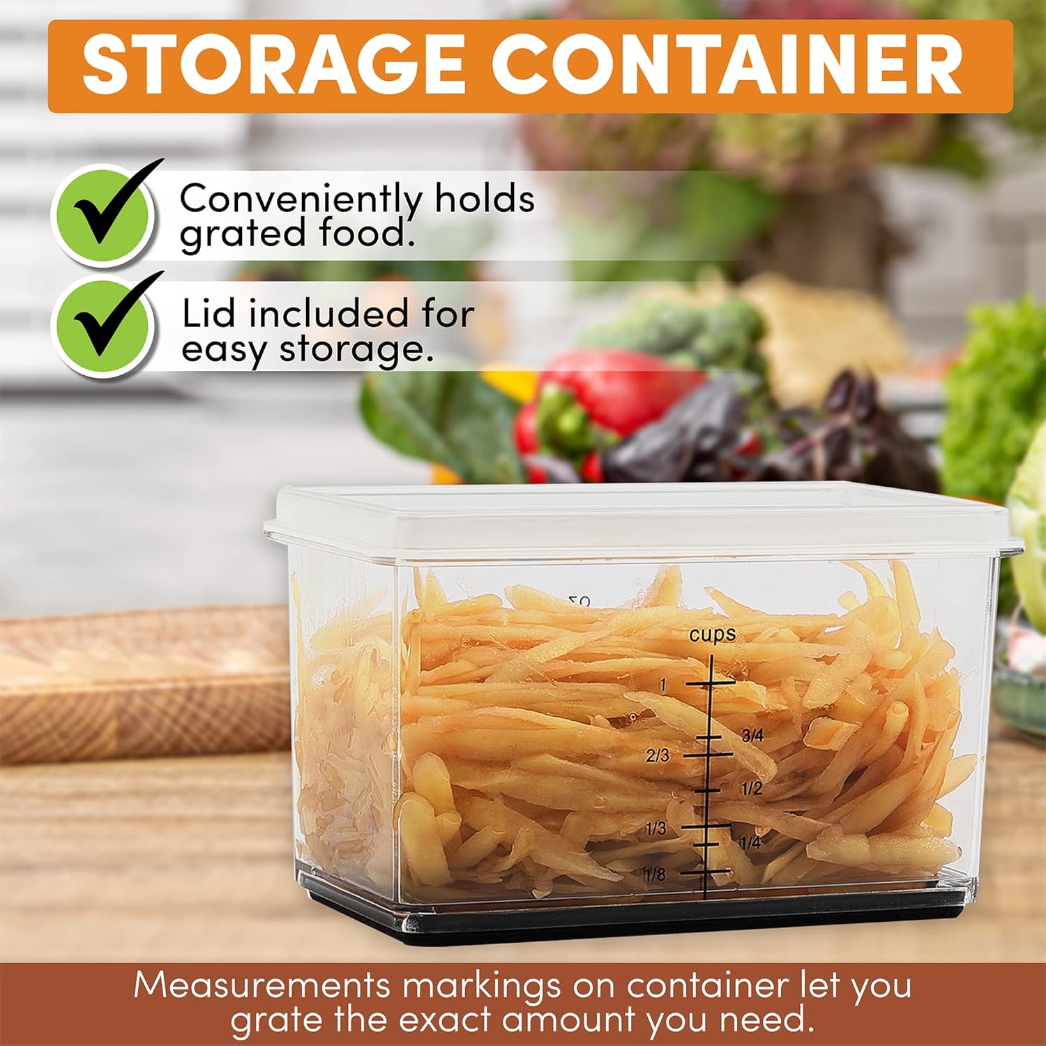 - Included Storage Container With Lid: The included storage box lets you grate directly into the container and store it with the lid. The container also has measurement markings on the side so you can get the perfect amount.