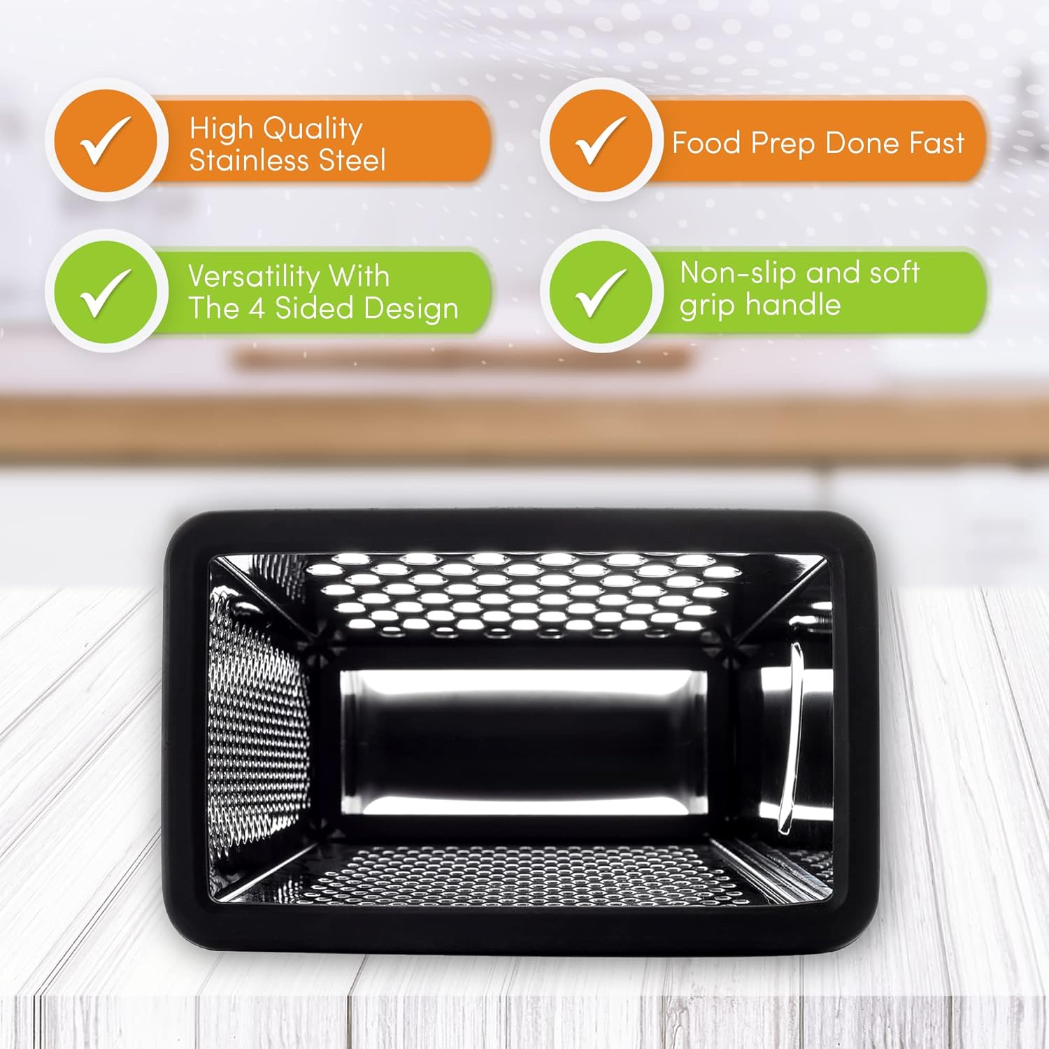 - Incredible Versatility With The 4 Sided Design Kitchen Grater: Coarse grating, Medium grating, Fine grating/Zester and even a Slicer - all in one convenient tool. Quickly prep an array of foods like cheese, parmesan, potato, squash, zucchini, carrots, lemons and cucumbers. Multi-functional with a comfortable handle that gives you total control.