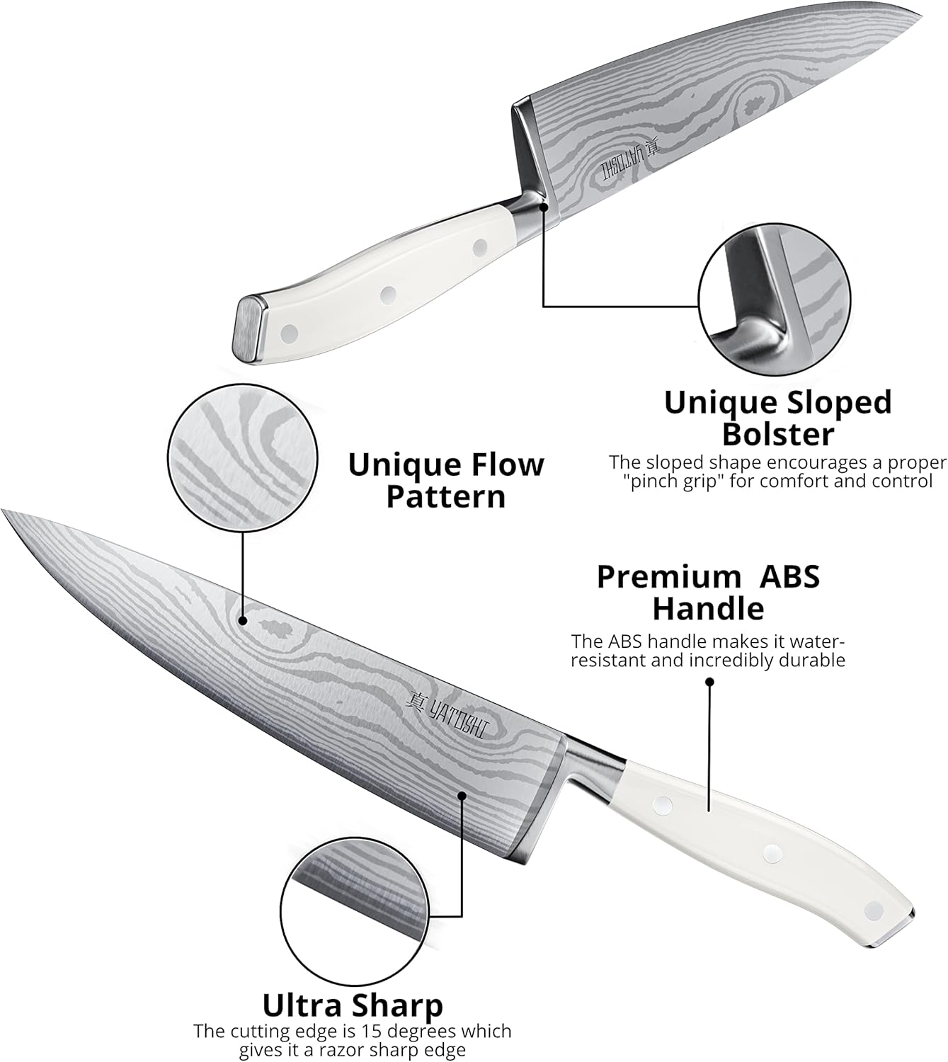 - High-Carbon Blades: Made with premium 7Cr17 High-Carbon Steel, which provides a razor-sharp, professional-quality blade. The steel contains 0.6-0.75 carbon, making it two times tougher than other knives in its class with a Rockwell Hardness of 57-58.