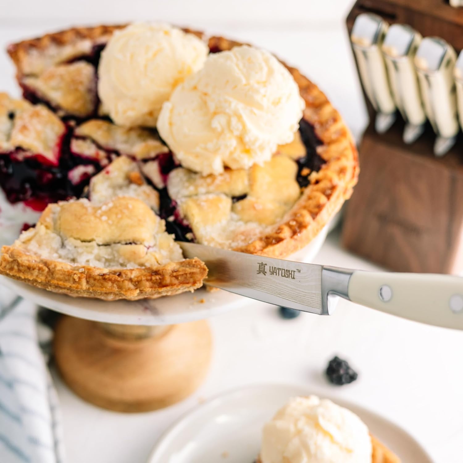 - Block: Constructed from robust and durable Acacia wood, the block features deep slots designed to safeguard the sharp blades, ensuring both protection and secure storage.
