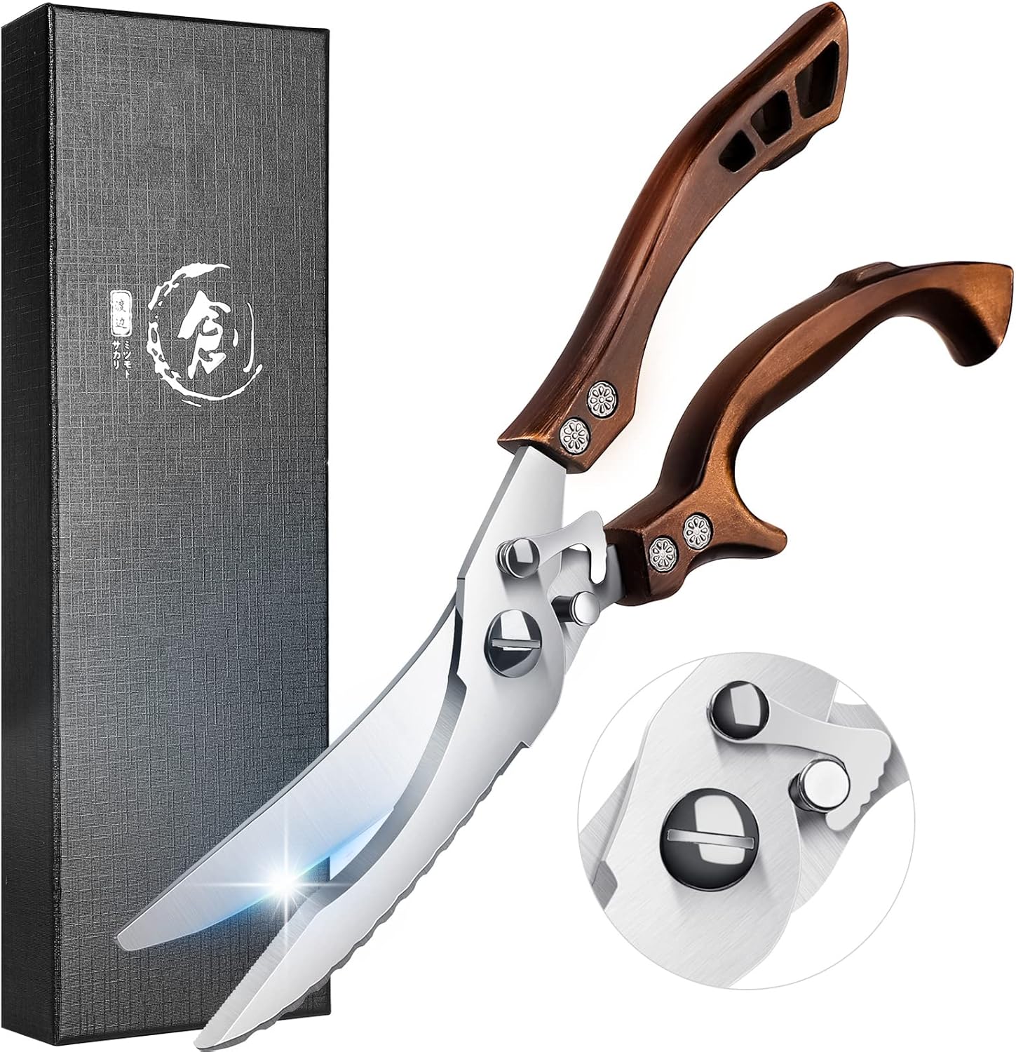 - 【PREMIUM QUALITY ULTRA-SHARP POULTRY SHEARS】The high-quality kitchen poultry shears forged from premium stainless steel are sharper and thicker. The blade of kitchen meat scissors is extremely sharp, and one of the blades with a serrated edge is suitable for scraping fish scales. It's effortless for kitchen chicken shears to slice through poultry, turkey wing, fish and cuts ingredients without slipping, which made it a vital role in the kitchen.