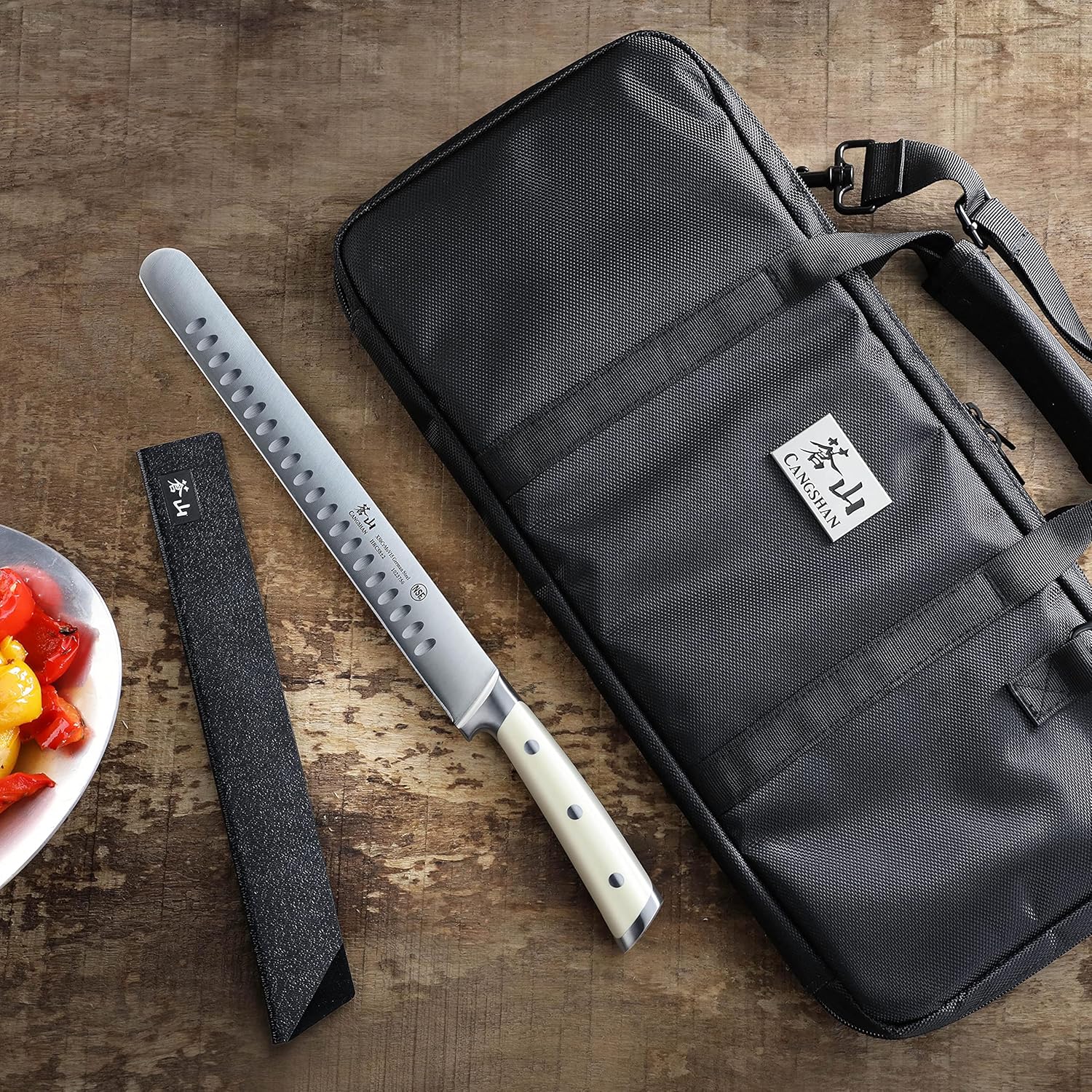 - 7-Piece BBQ Set Includes: 11" Slicing Knife, 10" Butcher's Knife, 7" Vegetable Cleaver, 6” Boning Knife, 6” Carving Fork, 3.5” Paring Knife, 5 Plastic Knife Sheaths, and a Cut Resistant Knife Bag