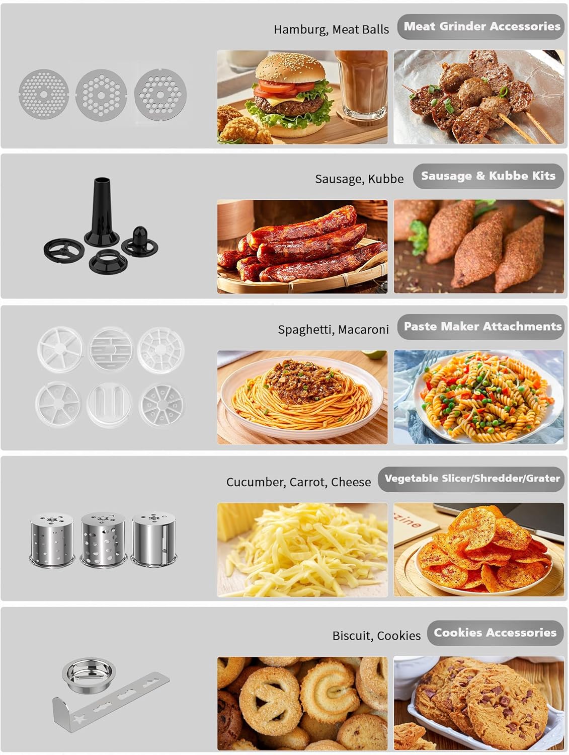 - 9-in-1 KITCHEN MACHINE - Vospeed kitchen stand mixer is a multi-functional food processor. It is equipped with a dough hook, whisk, beater, juice blender, meat grinder! Itโs a perfect kitchen helper for making cakes, bread, cookies, smoothies, juicer,salad, sausage, meat sauce etc. The splash guard helps to add ingredients without making a mess