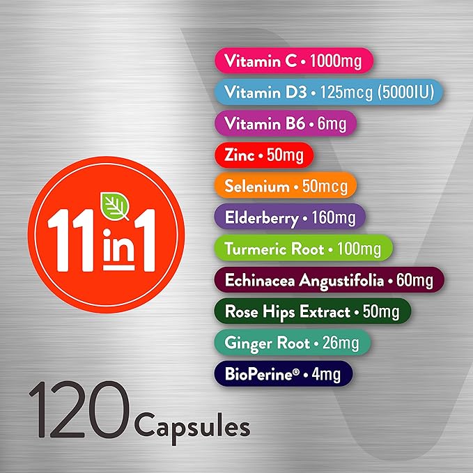 • 11-IN-1 DAILY MULTIVITAMIN – Includes Vitamin D3 5000 iu, Vitamin C 1000mg, Vitamin B6 6mg, Zinc 50mg, Elderberry 160mg, Turmeric 100mg, Echinacea 60mg, Rose Hips 50mg, Ginger 26mg, Selenium 50mcg, BioPerine 4mg.