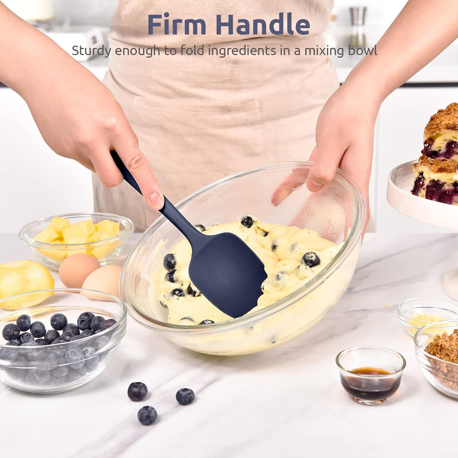 - [Sturdy Enough with Upgraded Core to Fold Ingredients in a Mixing Bowl] The handle of U-Taste baking spatula is firm all the way up to the center of the tool, with the softening increasing out to the edge. We upgraded the core so the cooking spatula doesn't bend through the handle and cause it to collapse and the core won't come through the mixing spatula. It's strong enough to stir thick mashed potatoes and fold blueberries into a coffee cake.