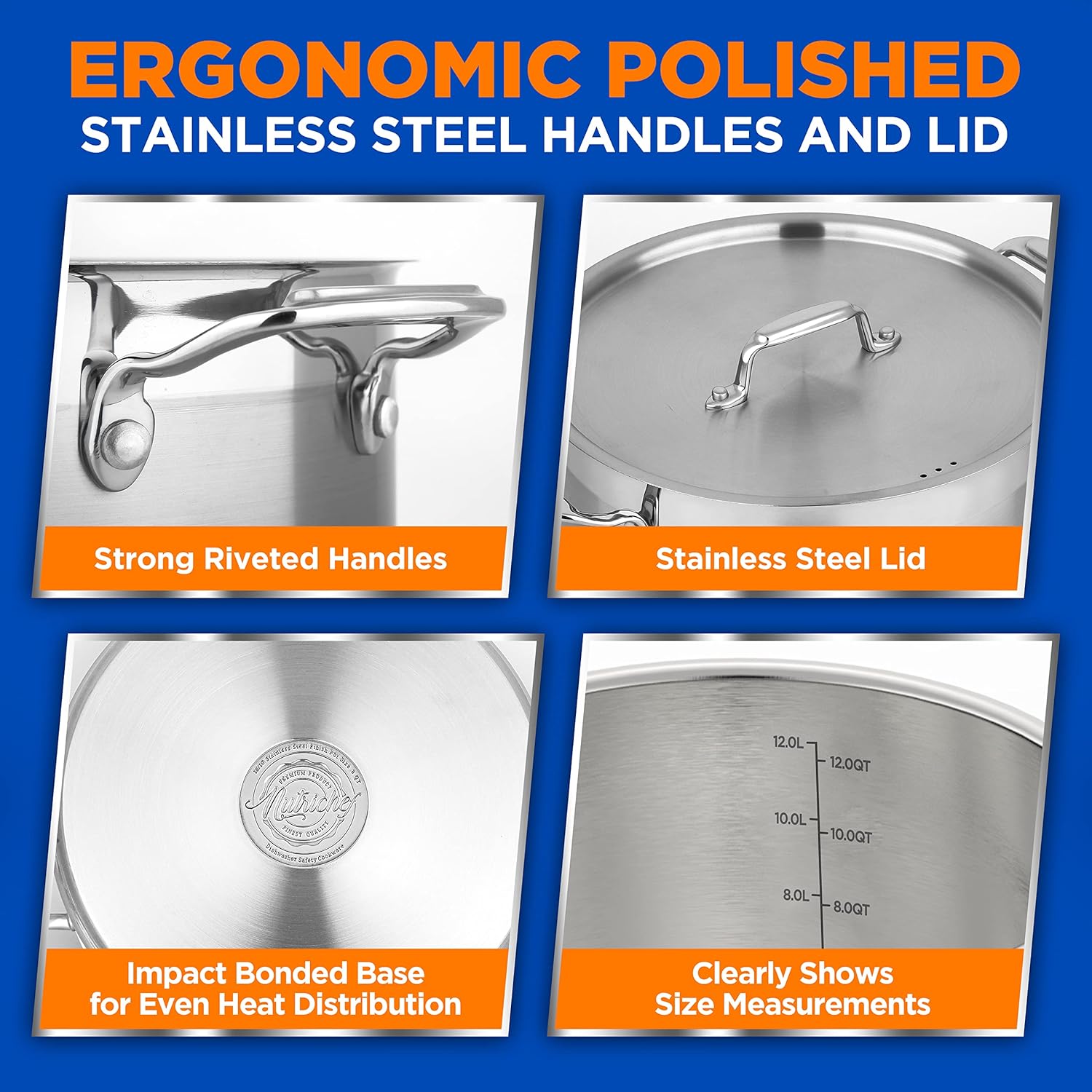 - 12 QUARTS:The NutriChef Stainless Steel Large Cooking Pot features 12-quart capacity weighing 5.6 lbs w/ lid which is the perfect size for boiling eggs, simmering stocks & soups or making sauces for a large crowd. Great for commercial & home cooking
