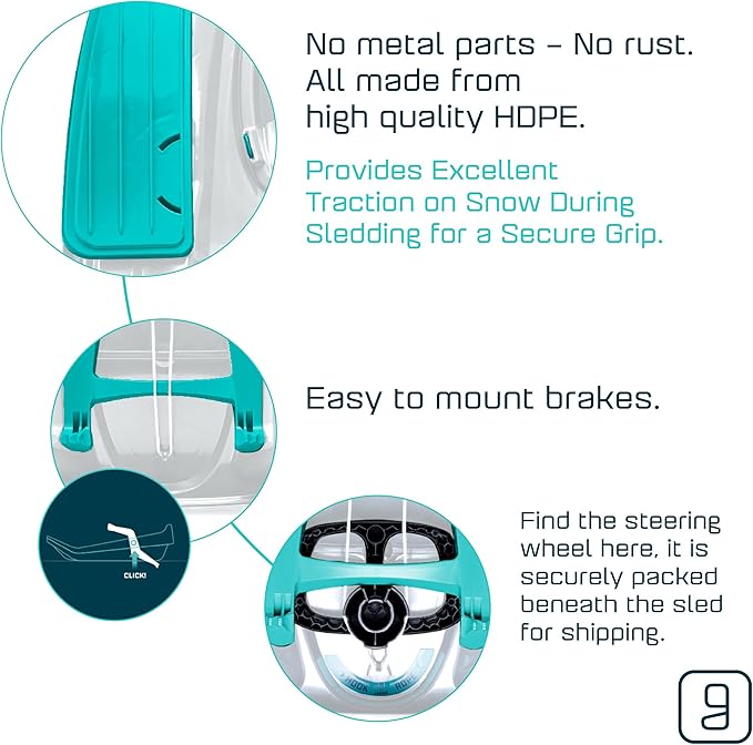 • SNOW SLED WITH BRAKES: A must-have for a safe and exhilarating sledding experience. The innovative design of the Stratos Snow Sled's brake system ensures that riders can easily stop, even on steep slopes