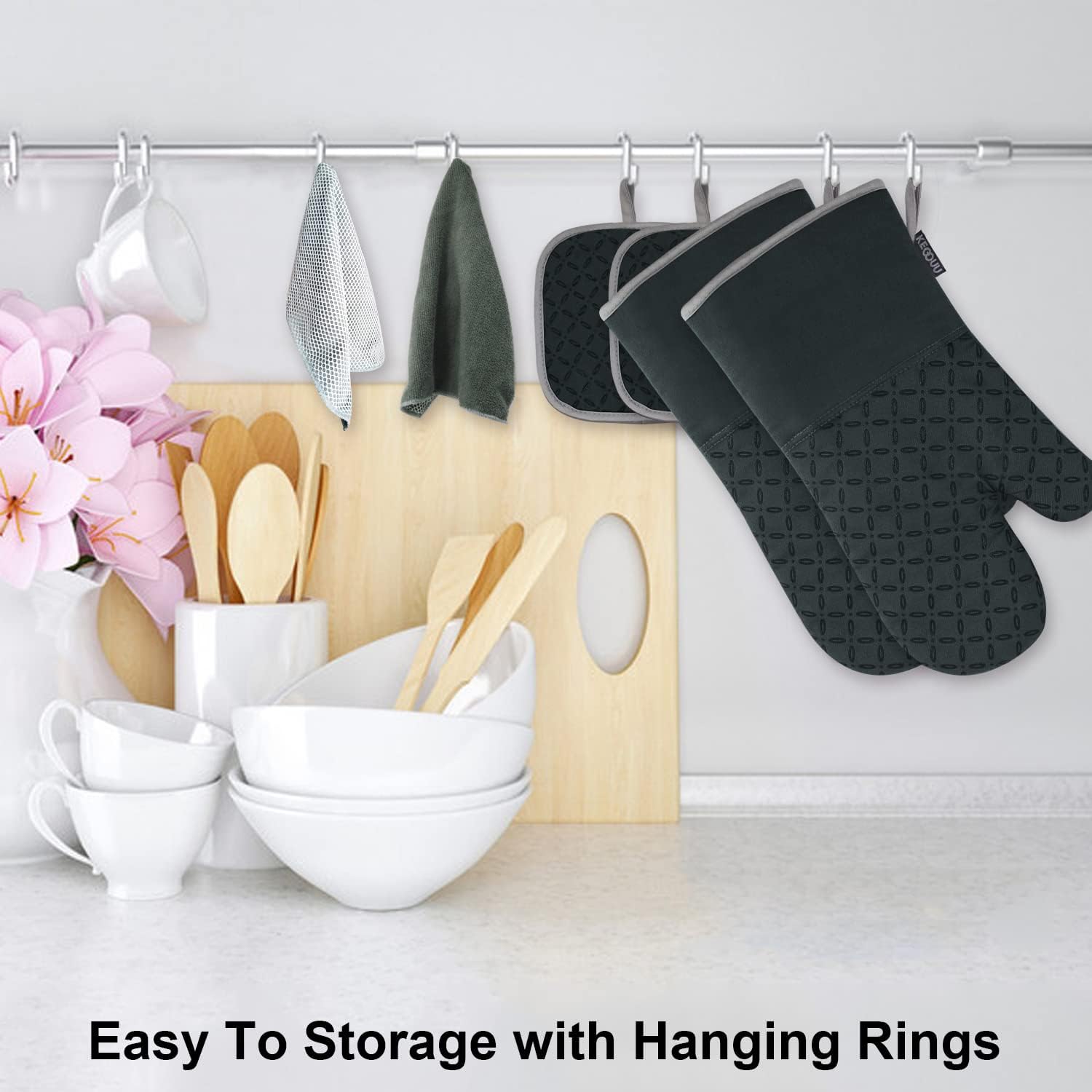 - EASY TO STORE-The kitchen oven mitts and pot holder come with rope design, so it is easy to store and hang them via the suspension rings when you are not using, save your room and make your kitchen look more cleaner