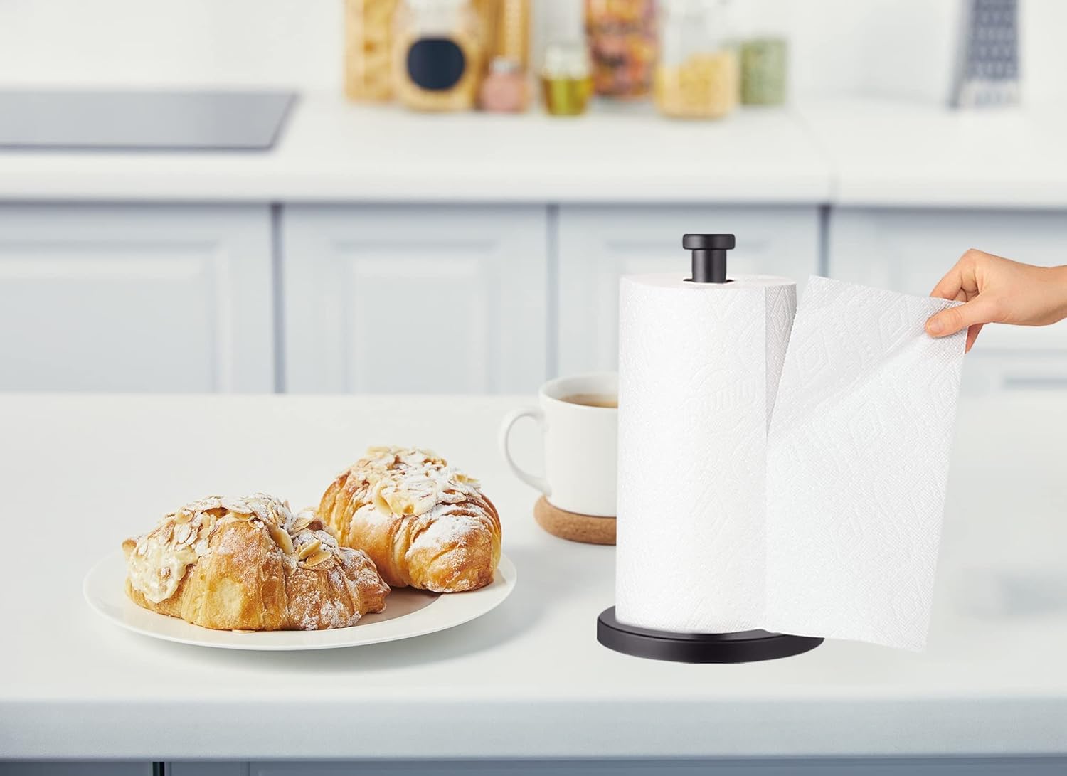 - 【Protect your Desktop】 - The base has a non-slip pad to prevent the paper towel holder from moving out of place. Also, it keeps your table top free from scratches.