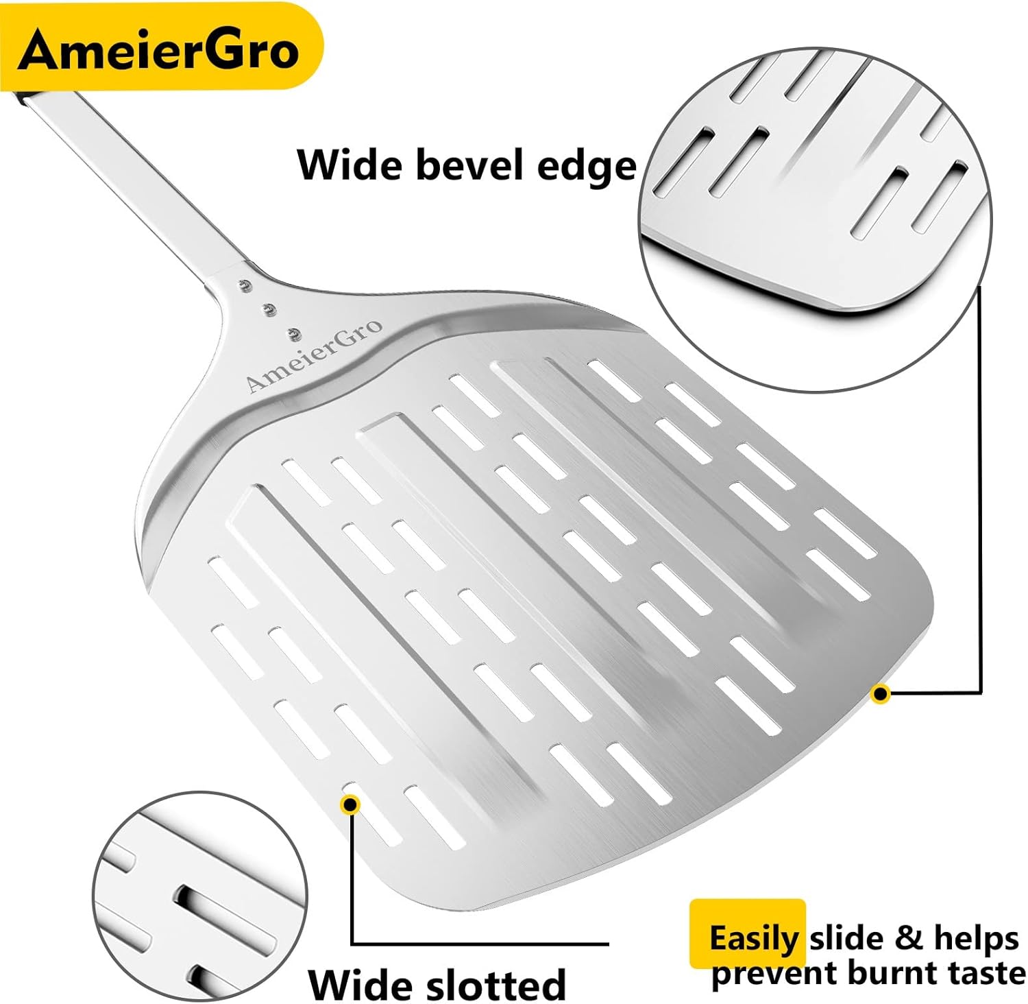 - NON-STICK & BEVELLED EDGES - Bevelled design to make pizza easier to slide down and lift up from the pizza stone. The commercial-grade anodizing process makes the pizza spatula more resistant to wear and tear and high temperatures than a wooden pizza paddle.
