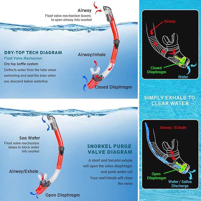 • Unobstructed breathing dry top snorkel: a high-quality snorkel with a dry-top valve that seals the breathing tube when submerged. dry top snorkel is designed to keep water from entering the breathing tube, ergonomic silicone mouthpiece is comfortable and durable. Lower purge valve allows water to be quickly expelled, so you can enjoy easy and unobstructed breathing while diving underwater.