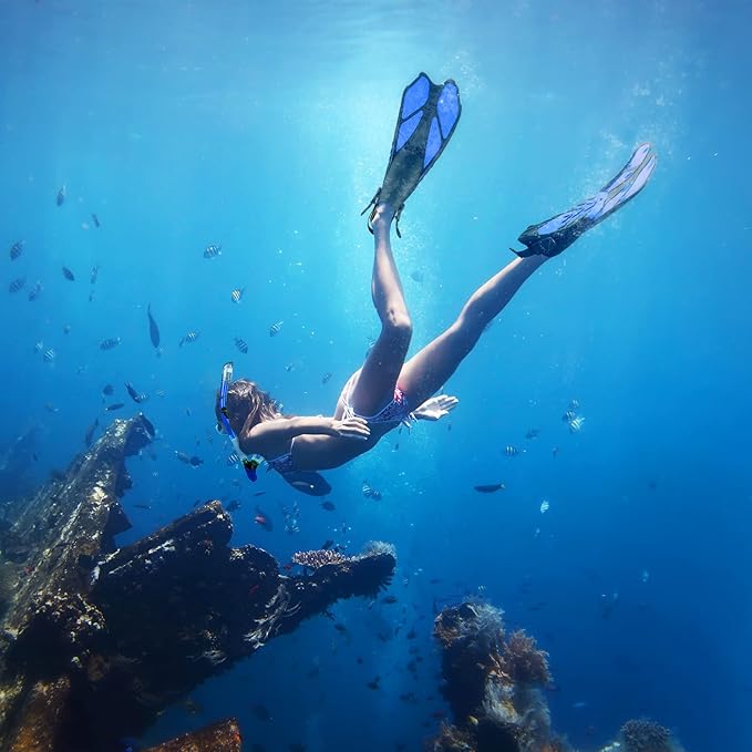 • Unobstructed breathing dry top snorkel: a high-quality snorkel with a dry-top valve that seals the breathing tube when submerged. dry top snorkel is designed to keep water from entering the breathing tube, ergonomic silicone mouthpiece is comfortable and durable. Lower purge valve allows water to be quickly expelled, so you can enjoy easy and unobstructed breathing while diving underwater.