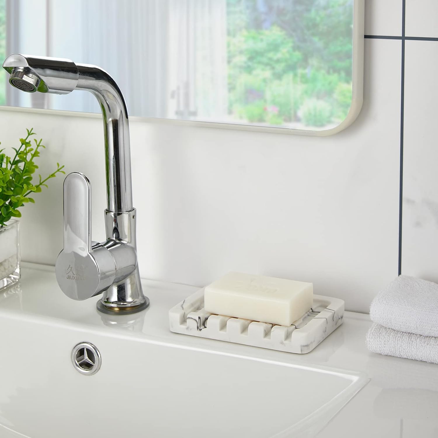 2PCS Self Draining Soap Dish - Marble Look Soap Holder Tray Savers Box Container Sponge Holder for Bathroom Shower Kitchen, White
