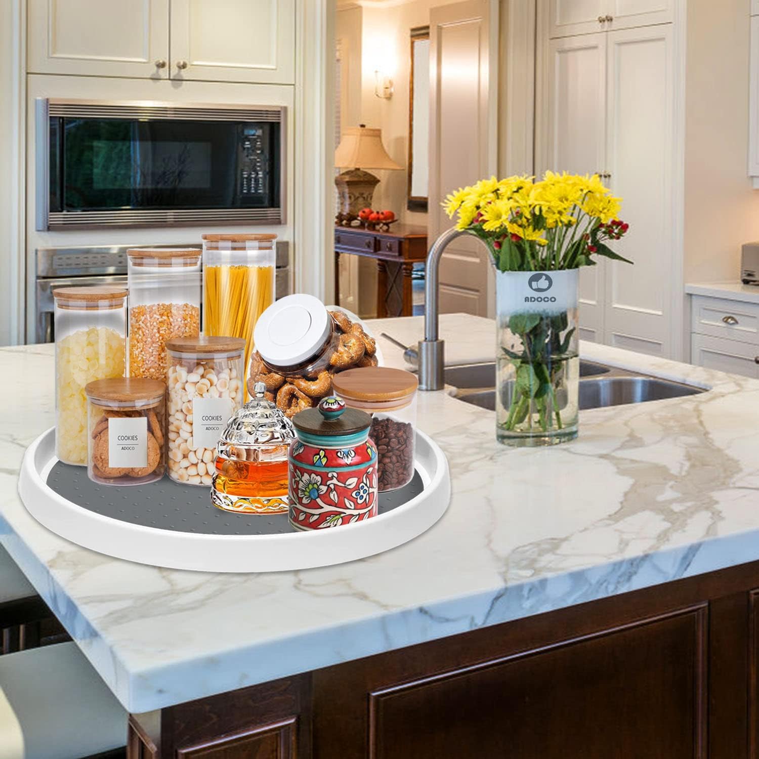 - TURN SMOOTH & NON-SKID -12 inch lazy susan organizer turns smoothly on sturdy stainless steel ball bearings; non-slide on spotted rubber surface and keep bottles and containers in place. This turntable organizer is perfect for kitchen and pantry organization and storage.