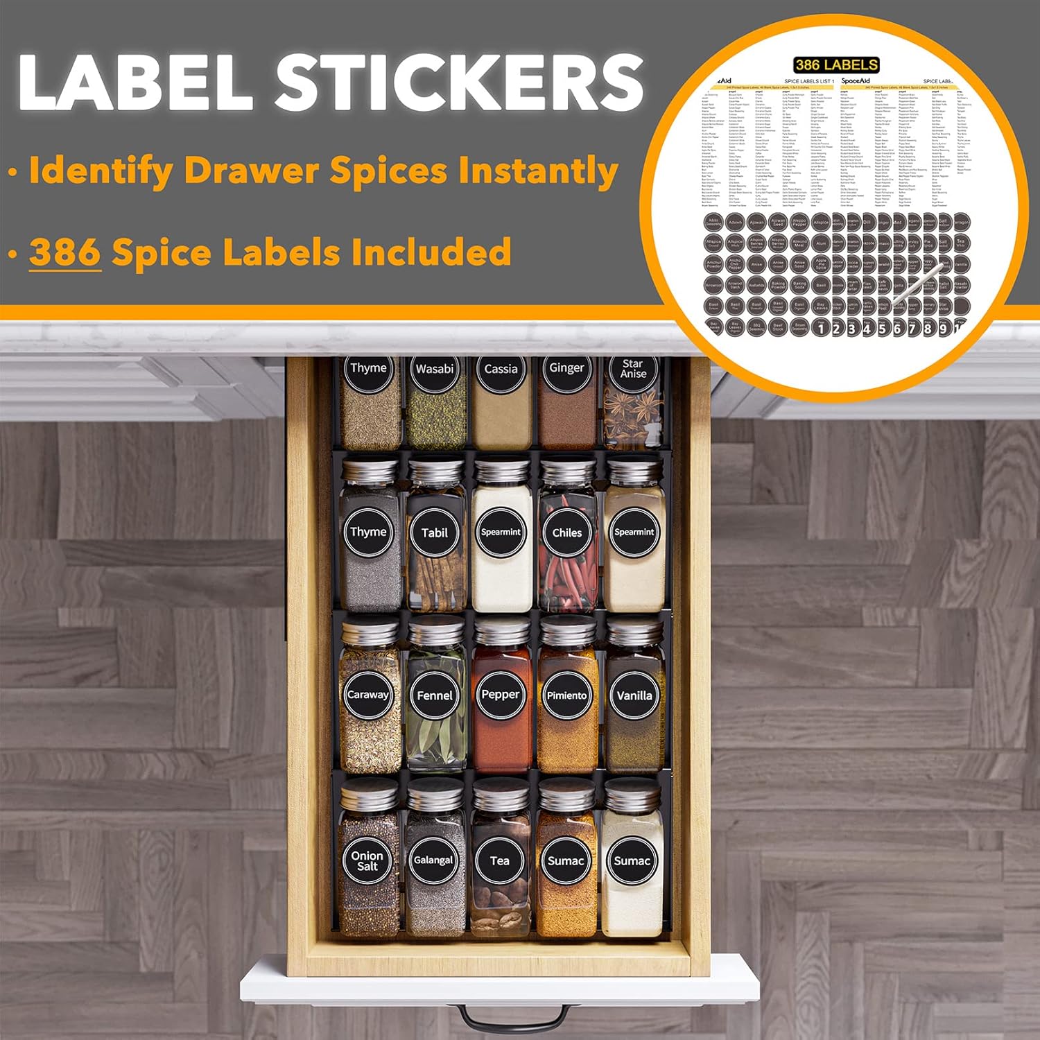 SpaceAid Spice Drawer Organizer with 20 Spice Jars, 386 Spice Labels, 4 Tier Seasoning Rack Tray Insert for Kitchen Drawers, 9-1/2" Wide x 17-1/2" Deep