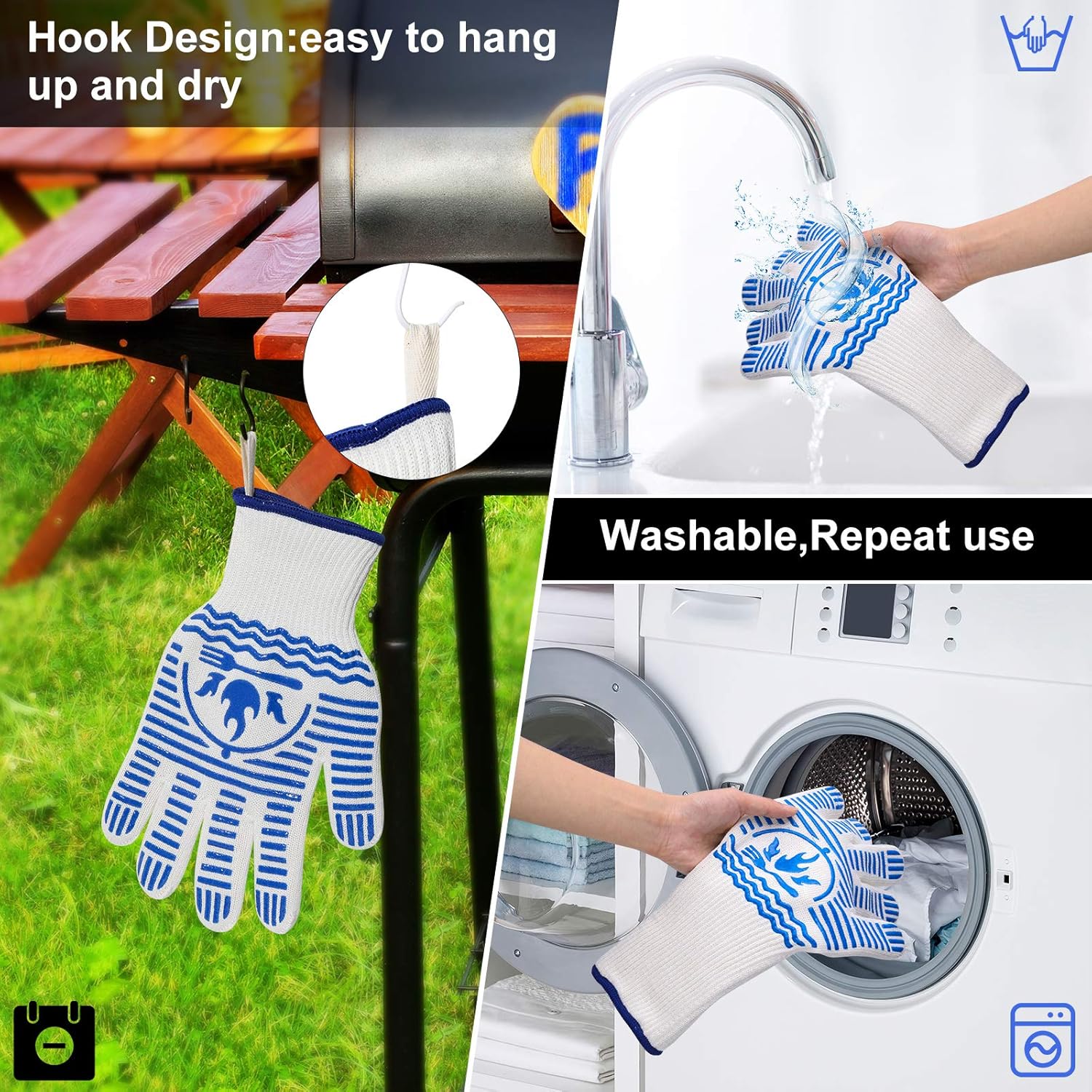 - Easy to Clean: Our grilling gloves are designed for your convenience. They can be easily cleaned by handwashing or machine washing, ensuring hassle-free maintenance. Additionally, the gloves feature a hanging rope design, making them easy to store and always within reach.