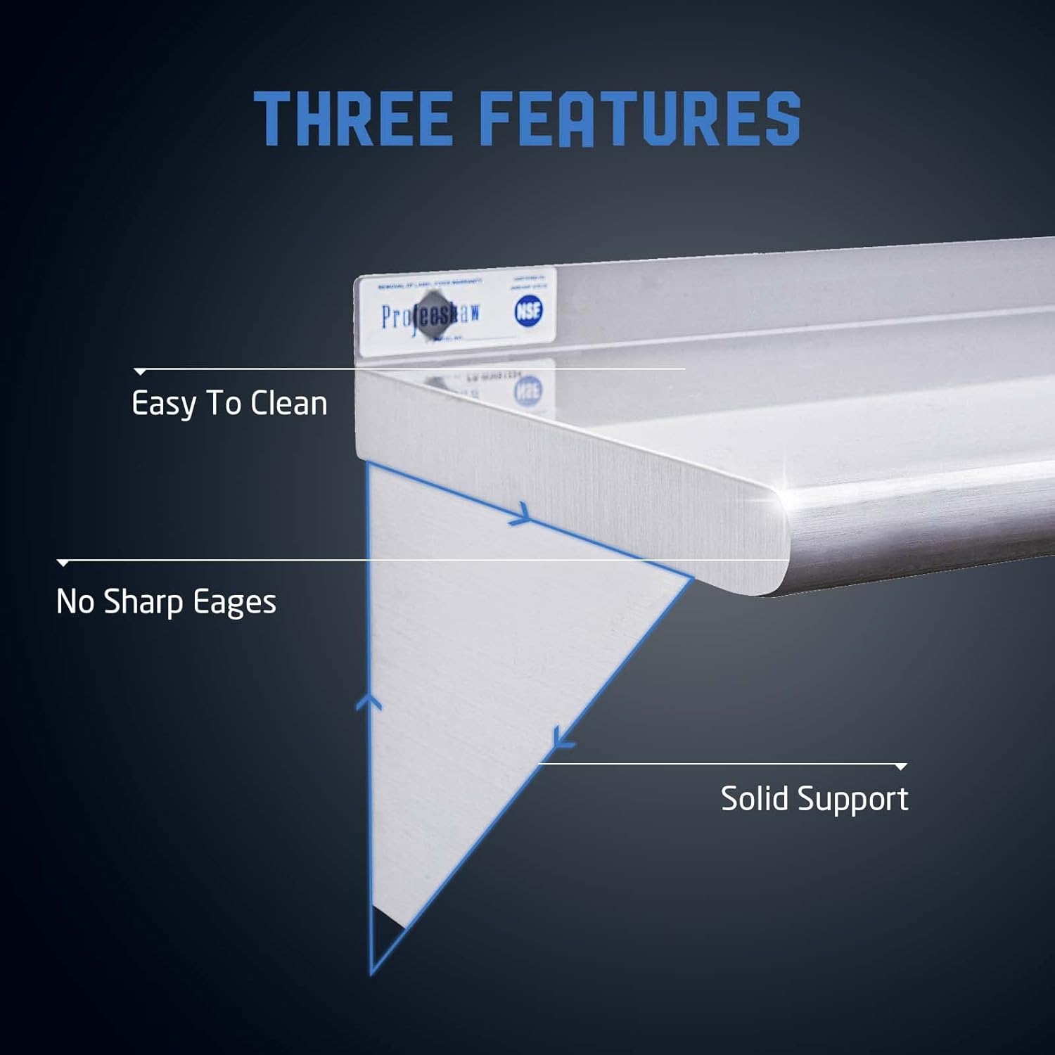 - Premium Stainless Steel: Made of 18 gauge Type 430 stainless steel, this wall mounted shelf is NSF certified to meet stringent public health standards and regulations. It is resistant to corrosion and rust, beautiful and practical, and durable. The food-grade stainless steel surface, is flat and smooth, which is easy to clean and sterilize