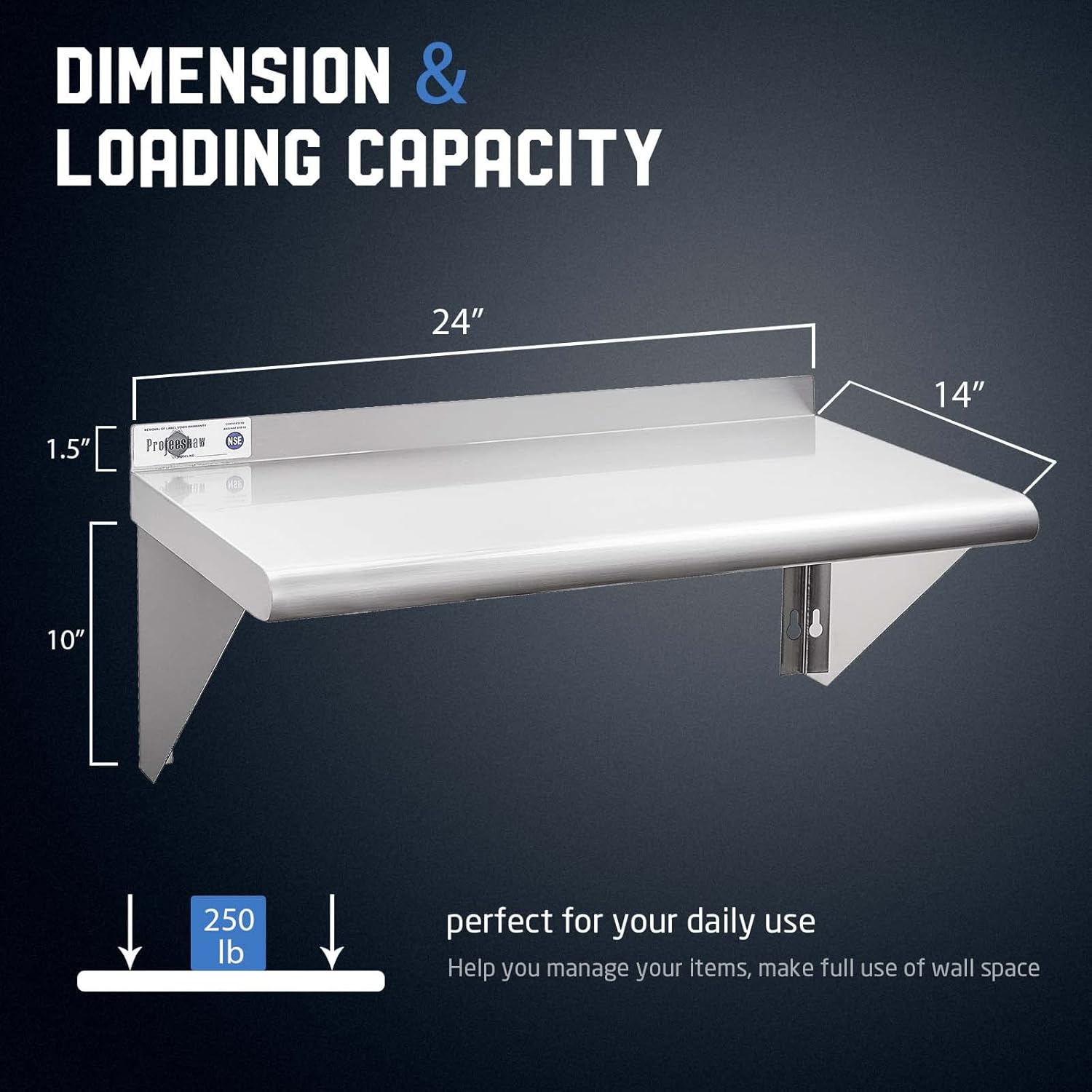 Profeeshaw NSF Stainless Steel Shelf 14” x 24”, 250 lb Commercial Shelves Wall Mounted Metal Shelving with Backsplash and 2 Brackets for Restaurant, Bar, Utility Room, Kitchen and Garage