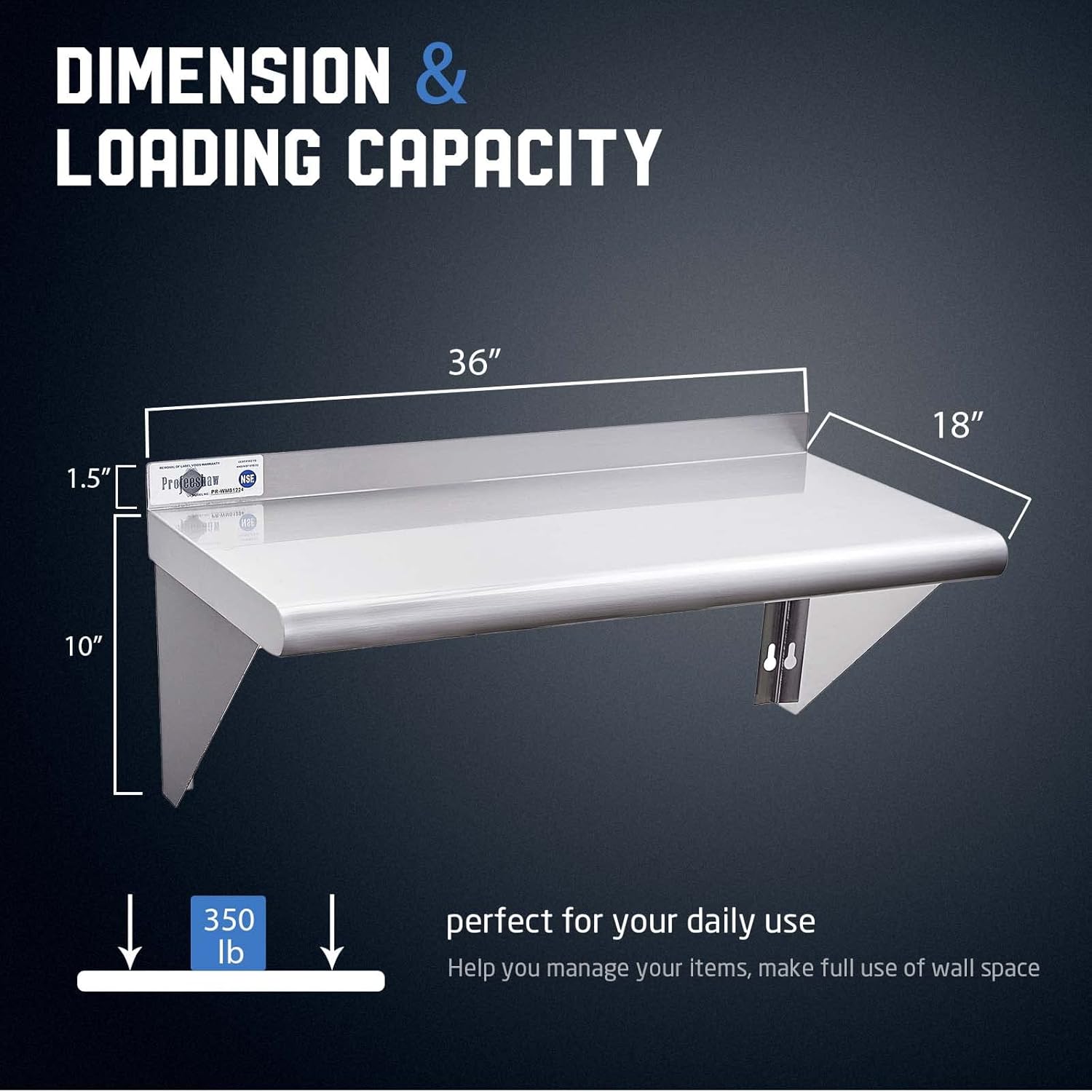 - Premium Stainless Steel: Made of 18 gauge Type 430 stainless steel, this wall mounted shelf is NSF certified to meet stringent public health standards and regulations. It is resistant to corrosion and rust, beautiful and practical, and durable. The food-grade stainless steel surface, is flat and smooth, which is easy to clean and sterilize