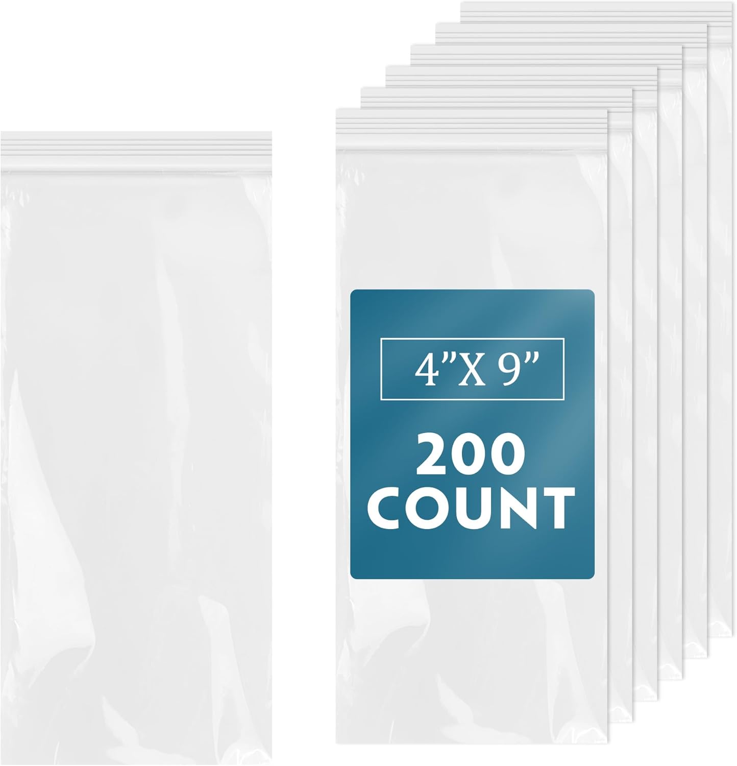 - [Specifications]: 200 PCS - 4" x 9"(Excludes Glue Flap) Resealable Zip Poly Bags - Self Sealing. 2 Mil Thickness.