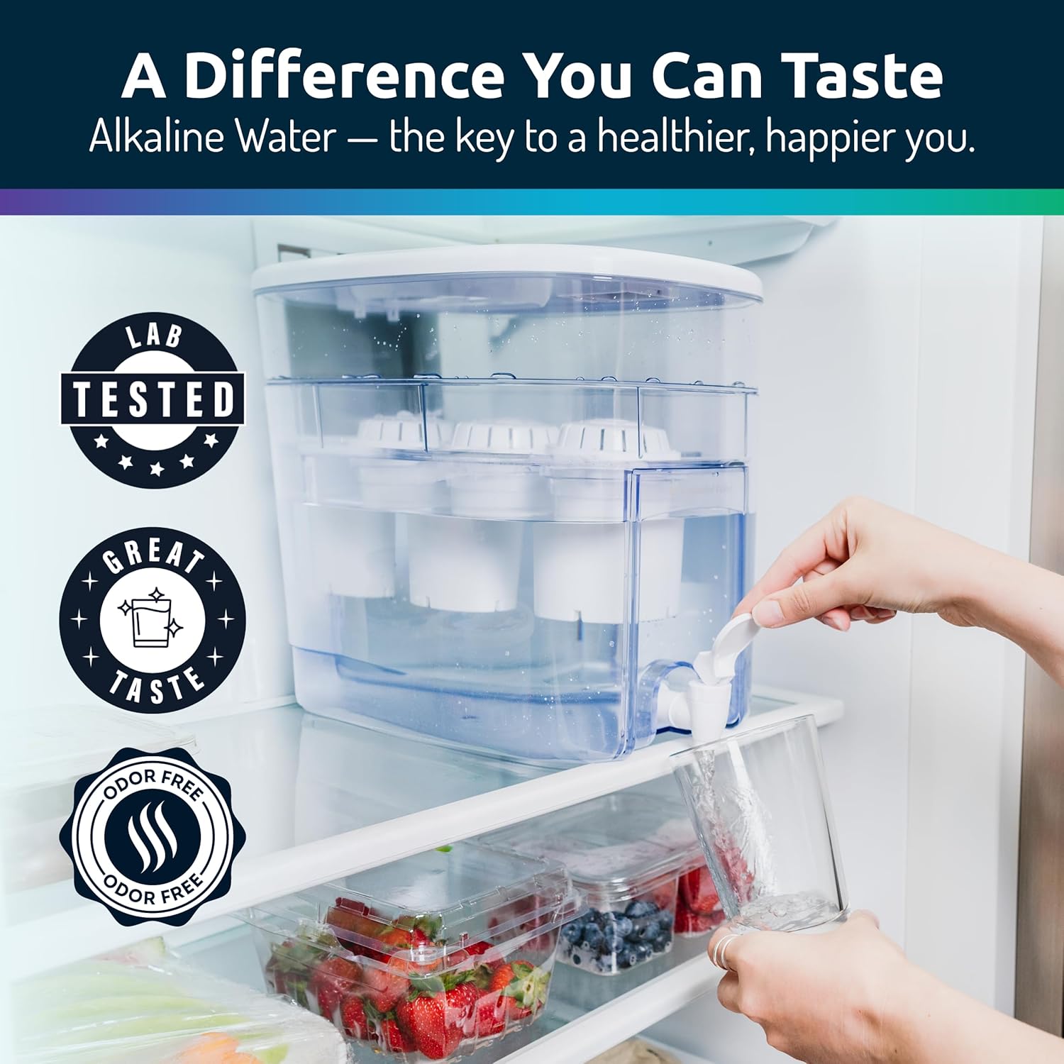 - HIGH PH ALKALINE WATER DISPENSER: Our Alkaline Water Machine for home is equipped with 3 pH001 filters. Each alkaline water filter increases pH up to pH9 and removes unwanted particles and heavy metals while keeping minerals like calcium & magnesium.