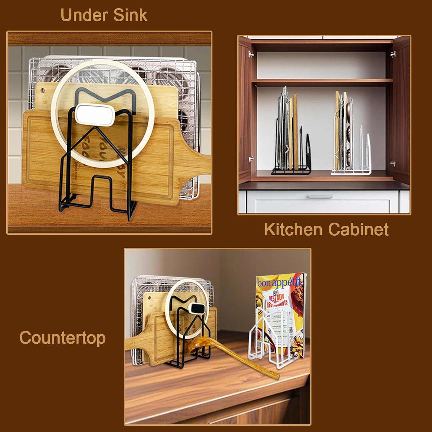 - VERSATILE FITS ANYWHERE: our cutting board rack organizers are great for small spaces or even tiny homes. they can be used in apartments, condos, RVs, campers and cabins. you can use it on your kitchen counters, in the cabinets, under sink cabinets, pantry and even your study room as a book stand.