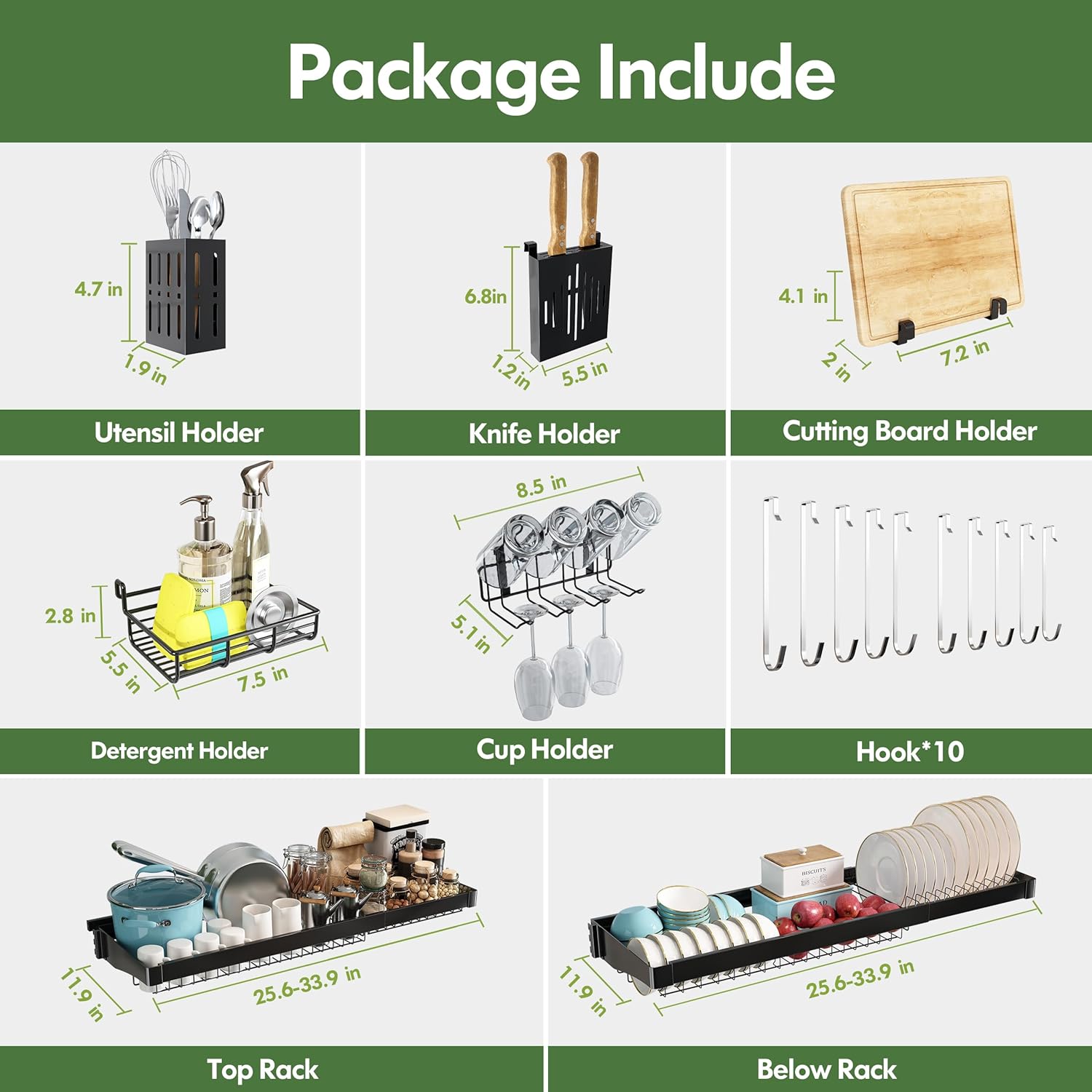 - π§Ί Multi Level Storage Efficiency: Three spacious tiers organize dishes by type, large cookwares on top, bowls and plates in the middle, while dedicated sponge holder and hanging hooks keep sponges and brushes accessible. The dish rack over sink open grid design accelerates drying by promoting airflow, reducing water spots