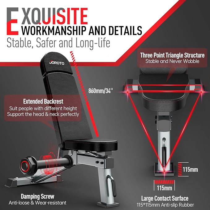 • [1000LB Safe Capacity & Heavy Duty Frame] – Built with 77×70×2mm commercial steel, dual back support tubes, widened stabilizers, and a reinforced triangular design, this JOROTO MD80 weight bench delivers up to 1000 lbs safe capacity (tested to 1200 lbs). Perfect for serious lifters who need maximum stability.