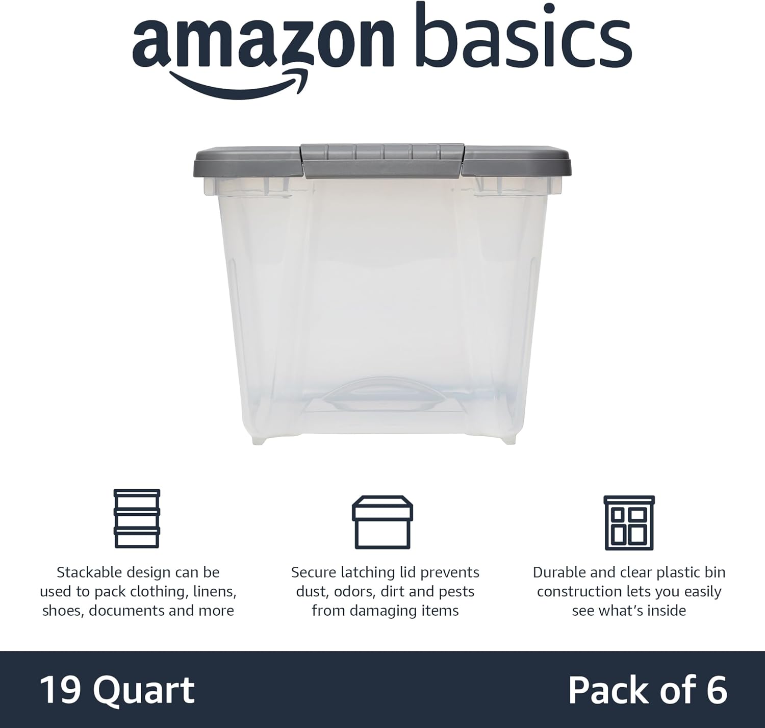 Amazon Basics Plastic Storage Containers with Secure Latching Lids, Stackable Organization Bins, Clear/Grey, 19 Quart, Set of 6