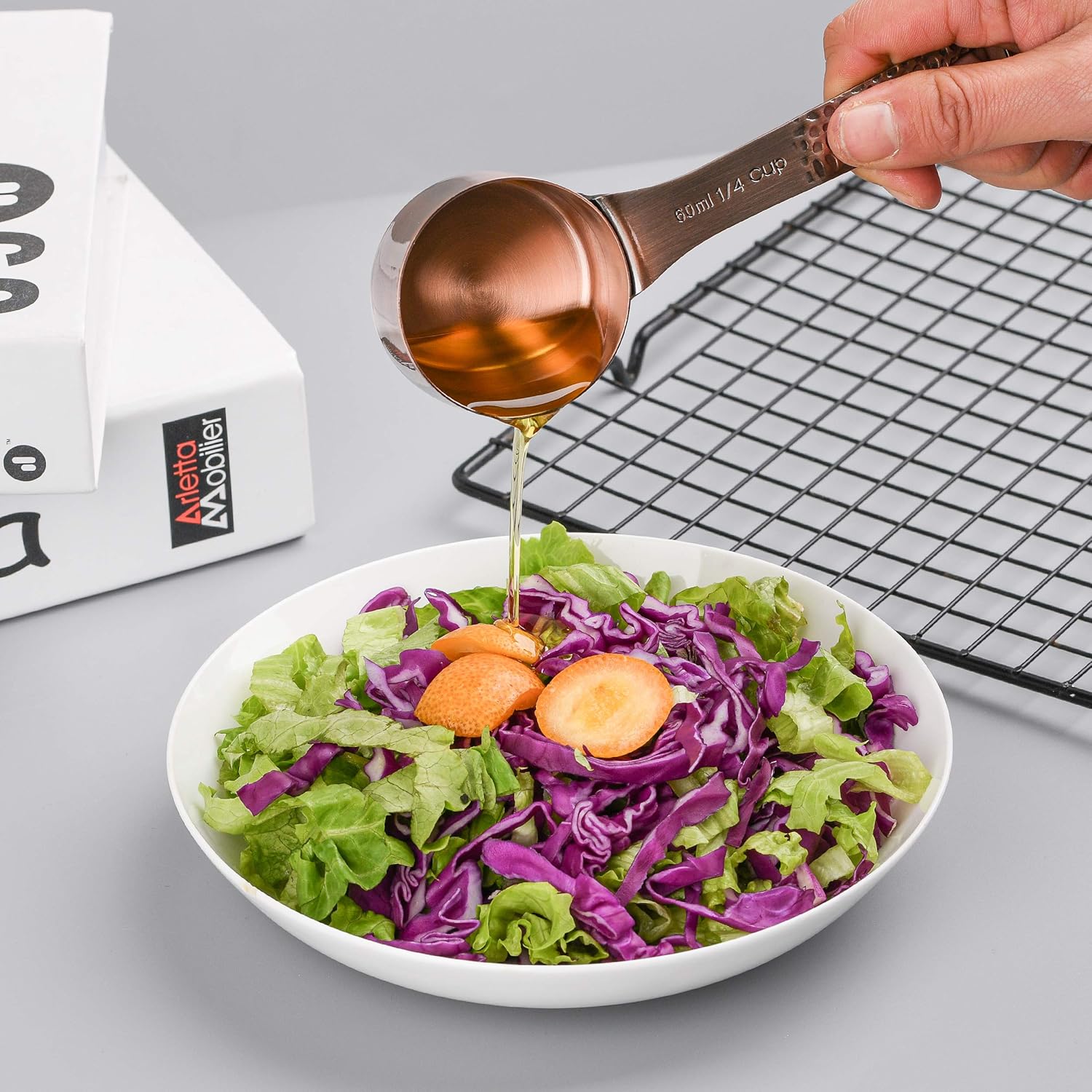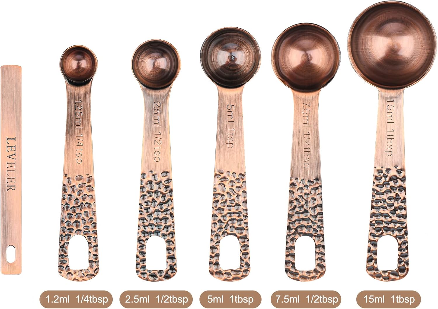- EASY TO CLEAN&STORAGE: Professional copper plated metal measuring cups and spoons set isn't dishwasher safe. Please wash it by hand. Easy to storage, just hang them on hook or stack them in drawer.