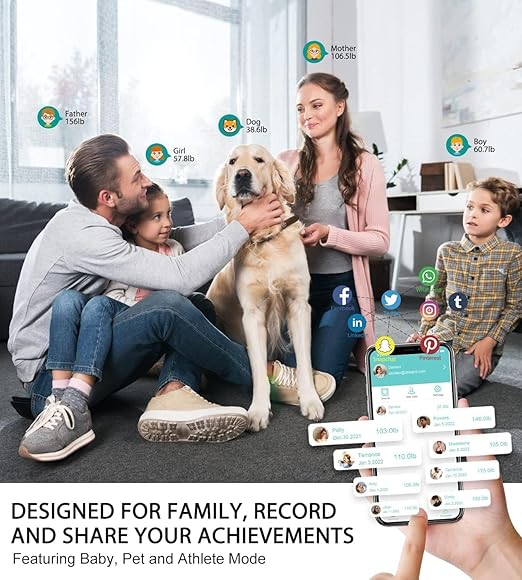 • 6.Multiple User Profiles: The "Fitdays" APP allows for unlimited user accounts, each holding up to 24 member profiles. It’s smart enough to automatically recognize who steps on, each user will receive the data on their own devices conveniently, which allows for seamless tracking of your family’s health. Use guest mode for a non-recorded check-in or baby mode to track your baby or pet's weight growth conveniently, the athlete mode provides more accurate measurements for professional athletes.