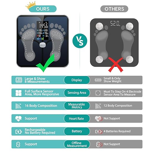 • 1.FSA & HSA Eligible/16 Essential Body Composition Analysis:Weight scale utilizes BIA to measure 16 body data include body weight,heart rate,BMI,muscle rate, body fat,subcutaneous fat,visceral fat,fat-free body weight,body water rate,skeletal muscle rate,muscle mass,bone mass,protein,BMR,heart index,body age.The data stored in the App help to know your body condition comprehensively.