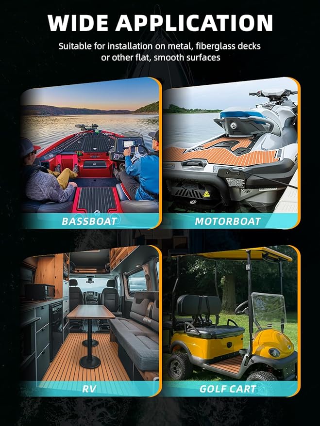 • Wide Application - Very nice faux teak boat flooring, different colorful patterns available. They are perfectly used for Motorboat, Jon Boat, RV Yacht Kayak, Surfboard, Swimming Pool, Garden flooring and other boat decking