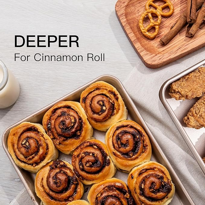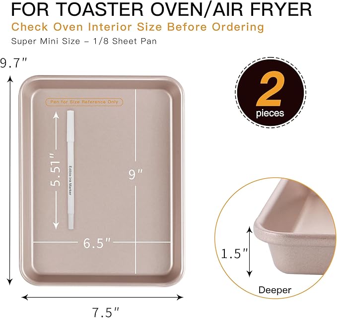 - ALL EXCLUSIVE SET - This oven tray is 9.7x7.5 inch cookie sheet, inner sizes:9x6.5x1.5 inches, outer sizes:9.7 x 7.5x 1.5 inches. This is a perfect size for baking cookies, pastry, cinnamon rolls, jelly rolls, mini cakes, vegetables, etc. Just one set can easily satisfy your daily baking needs and help you take your baking to the next level