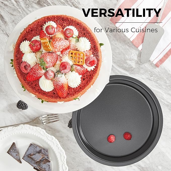 - PREMIUM EXTRA-THICK MATERIAL - With 27% thicker carbon steel, this durable 8inch cake baking pans set is constructed from heavy-gauge carbon steel for stability, even heat distribution, and durability for years to come. Warranty against peeling off with heat-resistance temperature: 450β