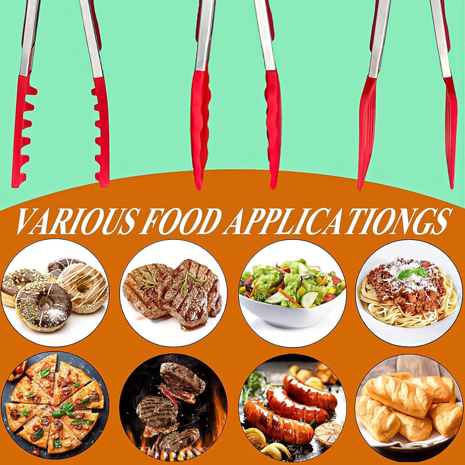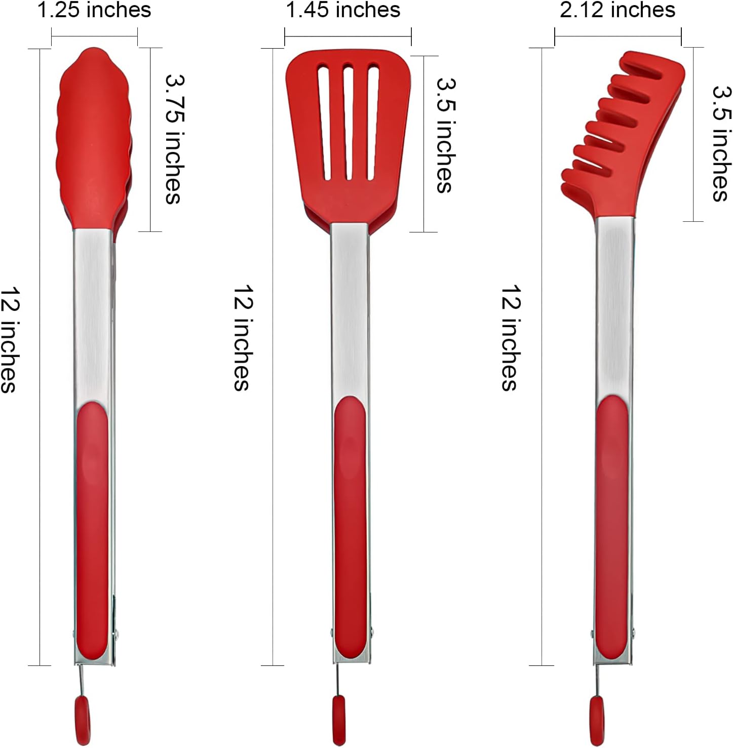 HST Tongs for Cooking with Silicone Tips(3 Pack), Non Stick Kitchen Tongs with Silicone Tip for Cooking BBQ Baking (12", Red)