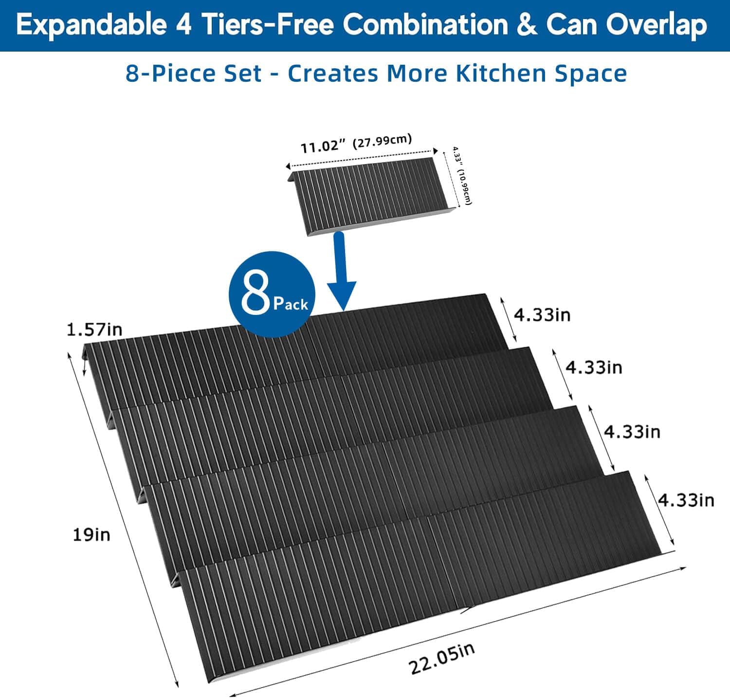 Spice Drawer Organizer, 4 Tier - 8 Pack Black Acrylic Drawer Seasoning Organizer, Expandable from 11'' to 22'', Premium Kitchen Spice Rack Organizers and Storage for Drawer