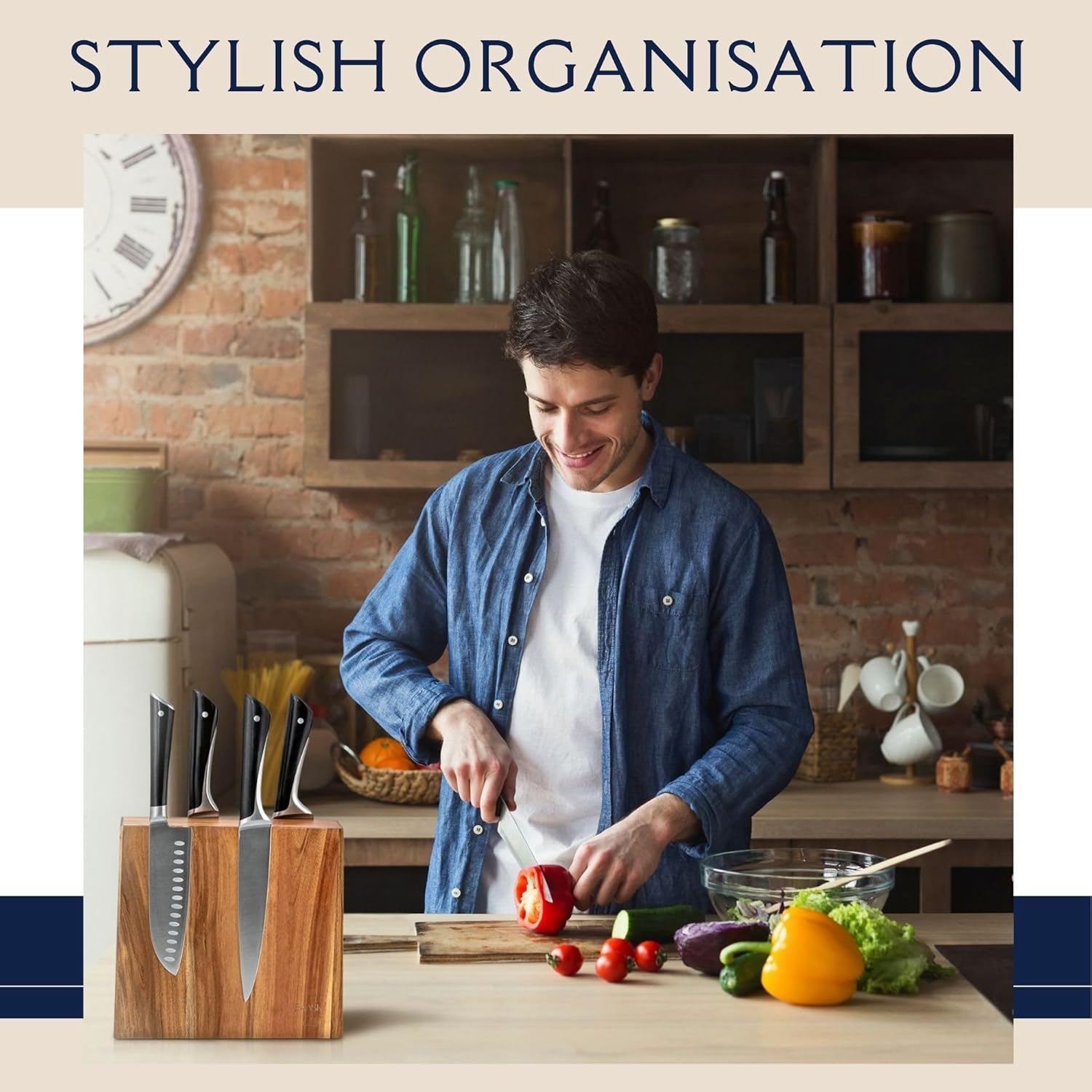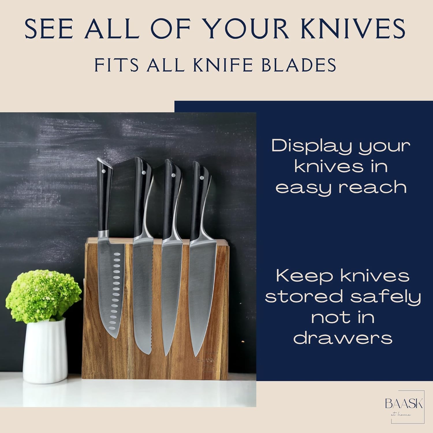 - SEE EVERY KNIFE AT A GLANCE Ditch the bulky knife drawer. With universal magnetic storage that fits all blade sizes, you’ll instantly spot the right tool for the task—and show off your collection in style