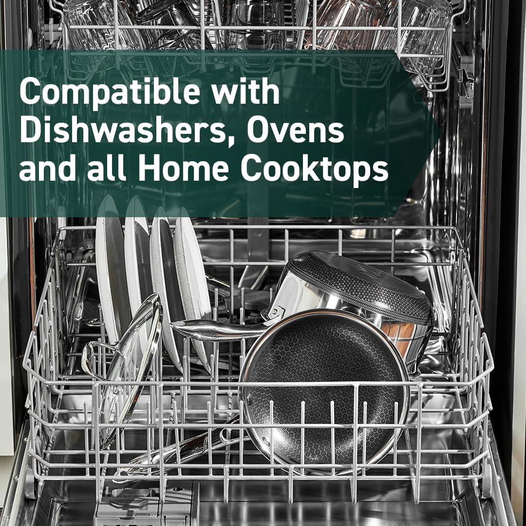 - Tri-ply construction with an aluminum core for quicker even heating, it’s safe to use on any home cooktop or stovetop, including induction. HexClad is metal utensil-safe, dishwasher-friendly, and oven-safe up to 900°F. (Tempered glass lids are oven-safe up to 400°F, while stainless steel lids are oven-safe up to 900°F.)