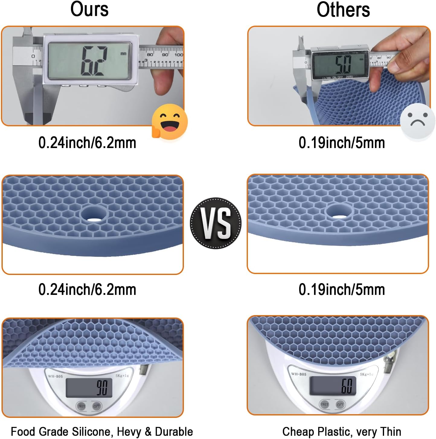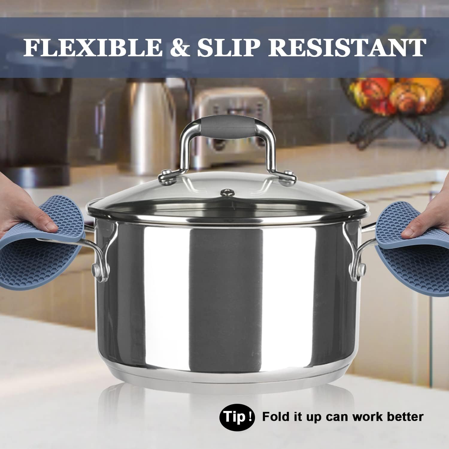 - 🎯 FOOD-GRADE SILICONE - Our oversized silicone potholders are made with 100% BPA-free food-safe silicone; durable and sturdy. This silicone trivet mat won’t break and won’t scratch the table surfaces. Slip-Resistant, and flexible enough to comfortably grab a hot dish.