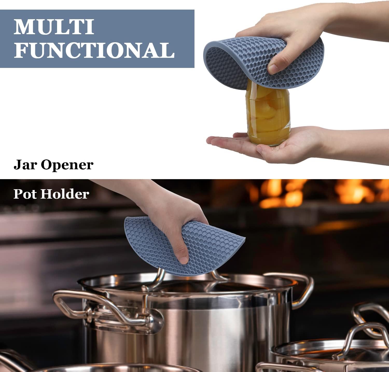 - 🎯 MULTIFUNCTIONAL TRIVETS - A must-have kitchen accessory. Save the valued kitchen space easily, each silicone trivet has a corner hole for convenient hanging storage and can use as a hot pad for countertops, blue spoon rest, utensil rest, hot pot holder, Jar opener, silicone table mat, silicone coaster, and garlic peeler.