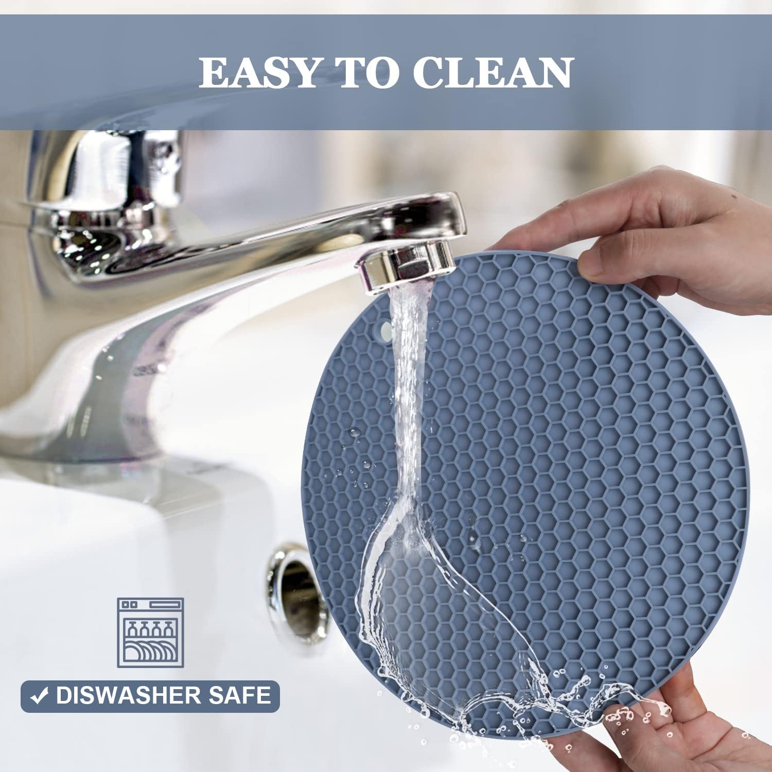 - 🎯 EASY TO CLEAN & 2 SIZES- Our blue silicone mats for the kitchen counter are easy to clean with water or in a dishwasher, cleaning with a brush if needed. Waterproof and naturally non-stick, regular silicone trivet size is 6.9" x 6.9", extra-large trivet size is 8.7" x 8.7", suitable for most bowls and plates.