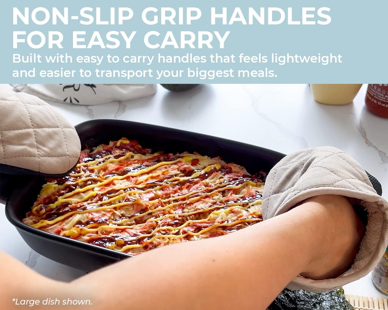 - The stunning and classic design of these oven to table serving dishes offer convenience while elevating your home dining experience. With a thoughtful design, from the non-slip handles that are easy to grip, a stackable design for easy storage that’s light to handle, a non-slip bottom, and rounded edges for ease of cleaning.