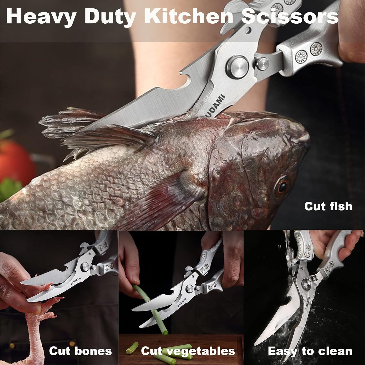 - Every home needs a pair of heavy-duty kitchen scissors and utility scissors heavy duty multipurpose scissors that are labor-saving, strong and sharp.AUDAMI kitchen scissors set for the home kitchen is the perfect choice, they include 1 upgraded heavy duty kitchen shears, and 1 Golden cooking scissors. Giving you the best kitchen scissors for the least amount of money.Makes your life easier! So get the AUDAMI multi-purpose utility scissors set and upgrade your kitchen equipment.