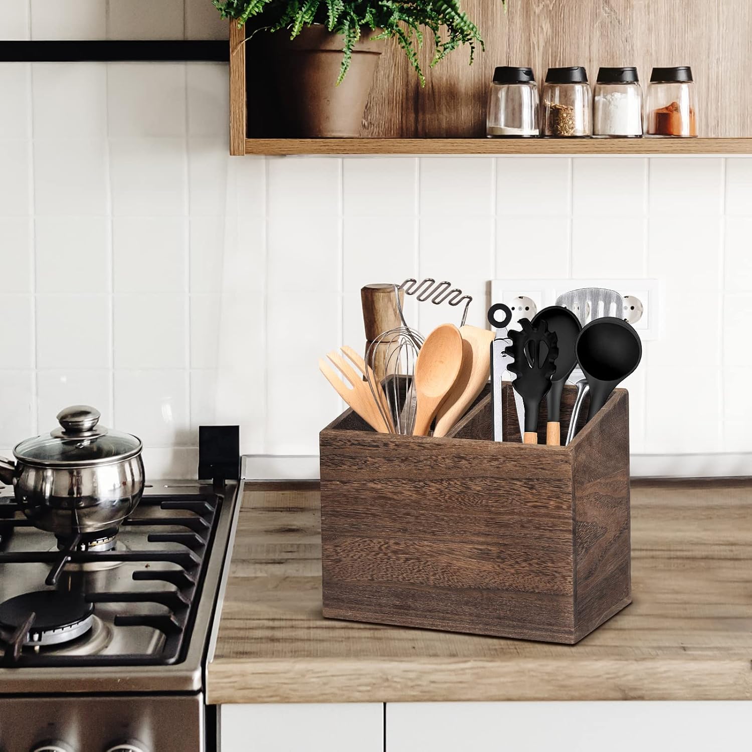 - 【Considerate Design and Service】Our Farmhouse Utensil holder is the perfect decorative touch to your kitchen countertop.Open top design ensures utensils are always visible and accessible.Never dig through a kitchen drawer organizer to find your favorite essentials again. The cooking utensil holder adds rustic farmhouse atmosphere with its original wood texture. The farmhouse utensil crock is practical as well as decorative