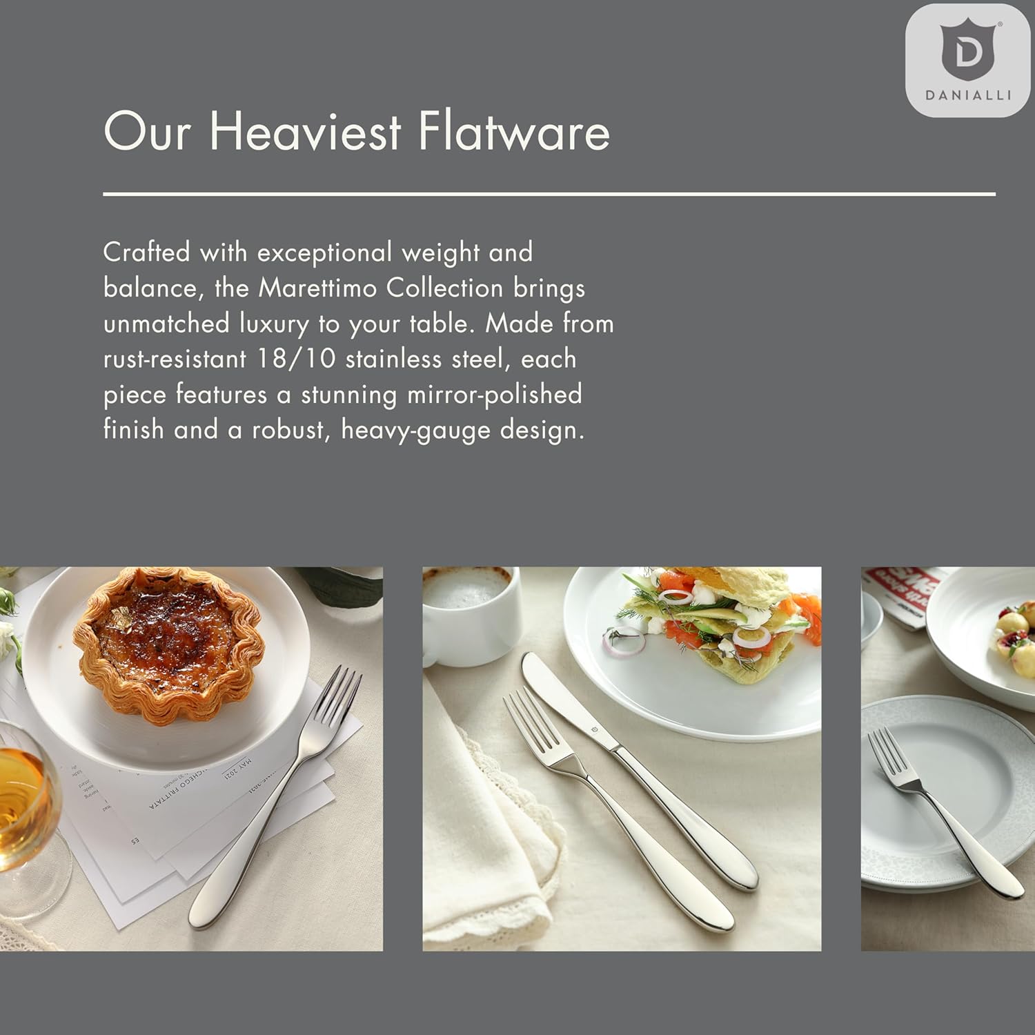 - The heaviest in DANIALLI's collection: Crafted from solid 18/10 stainless steel, each piece delivers a well-balanced, substantial grip youβll feel the moment you pick it up.