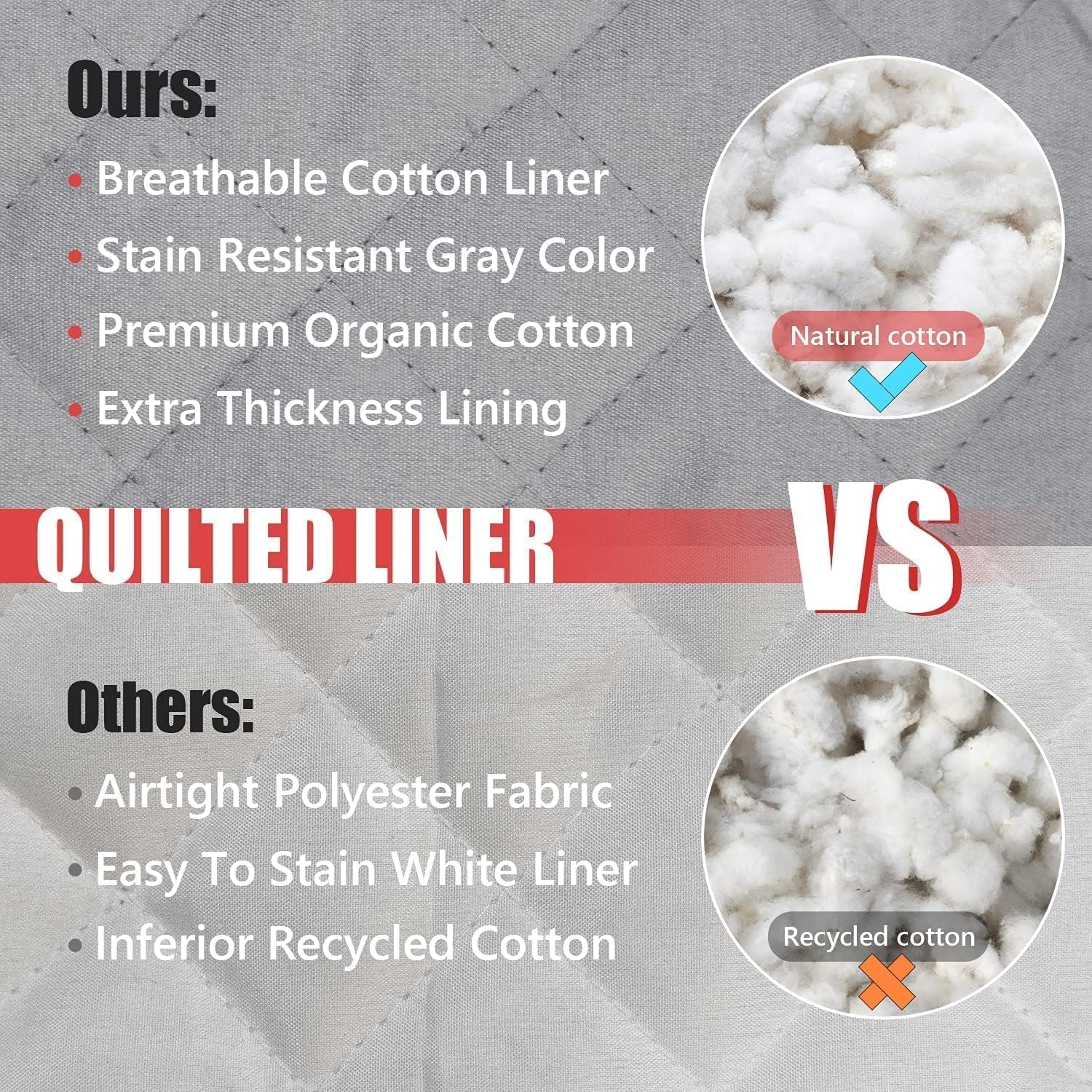 - Unlike other oven mitts using recycled cotton, our mitt's quilted liner is made of premium natural cotton and offers great control and comfort without sacrificing dexterity. It provides good protection and comfortable touch for your hand till your forearm and has good stain resistant thanks to the gray color liner fabric design.