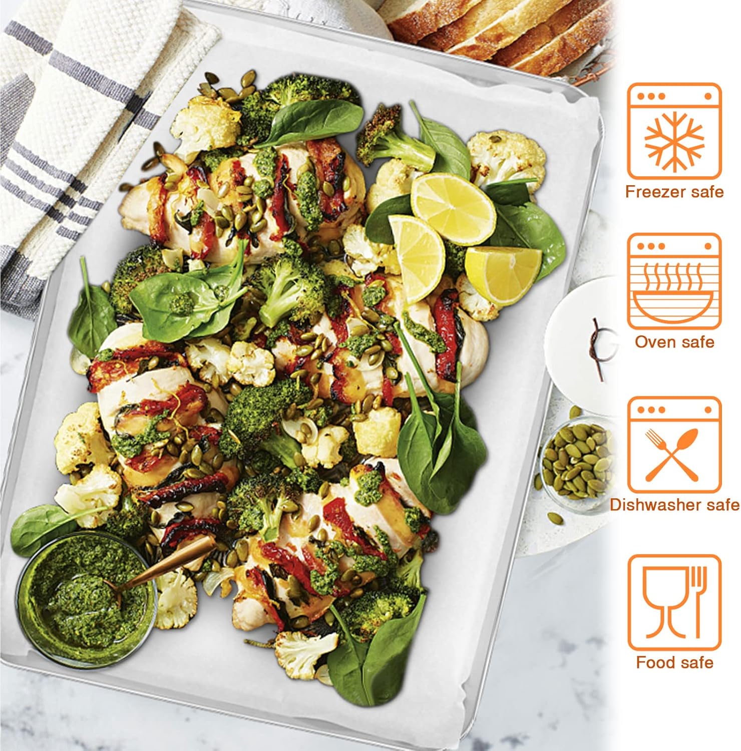 - 【2 PACK WITH 50 PARCHMENT PAPER】2 PCS baking sheets can be replaced easily, Great for broiling and roasting anything from layered sheet cake, pizza to vegetables, Comes with 50pcs grease-proof/water-proof food-grade parchment paper, No need to trim and sit perfect in the pan, Prevent sticking and easy release foods