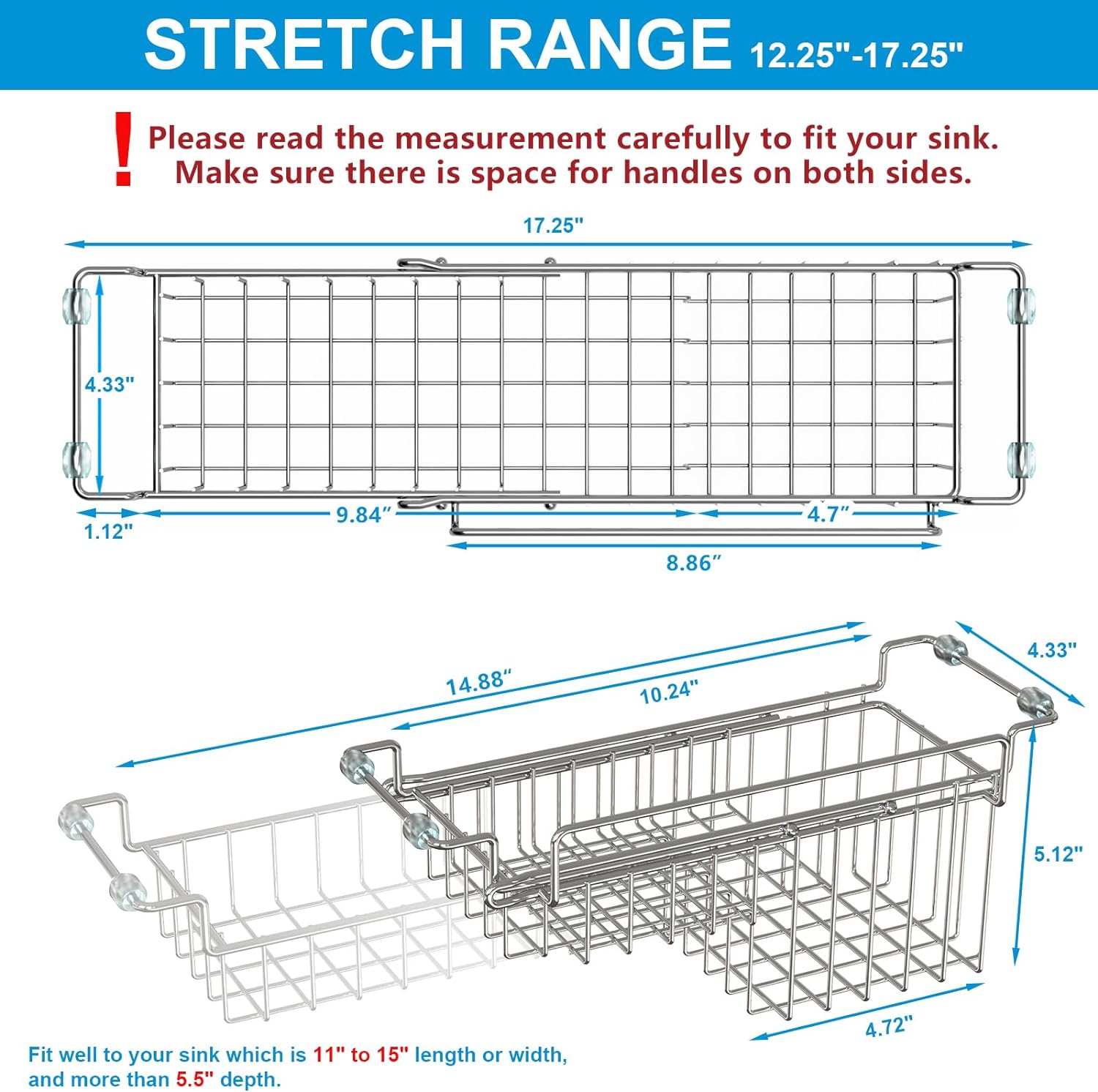 Over The Kitchen Sink Caddy Sponge Holder Organizer Drying Rack Expandable for Sponge Brush Soap Dish Cloth Rag, Stainless Steel (12.25" to 17.25")