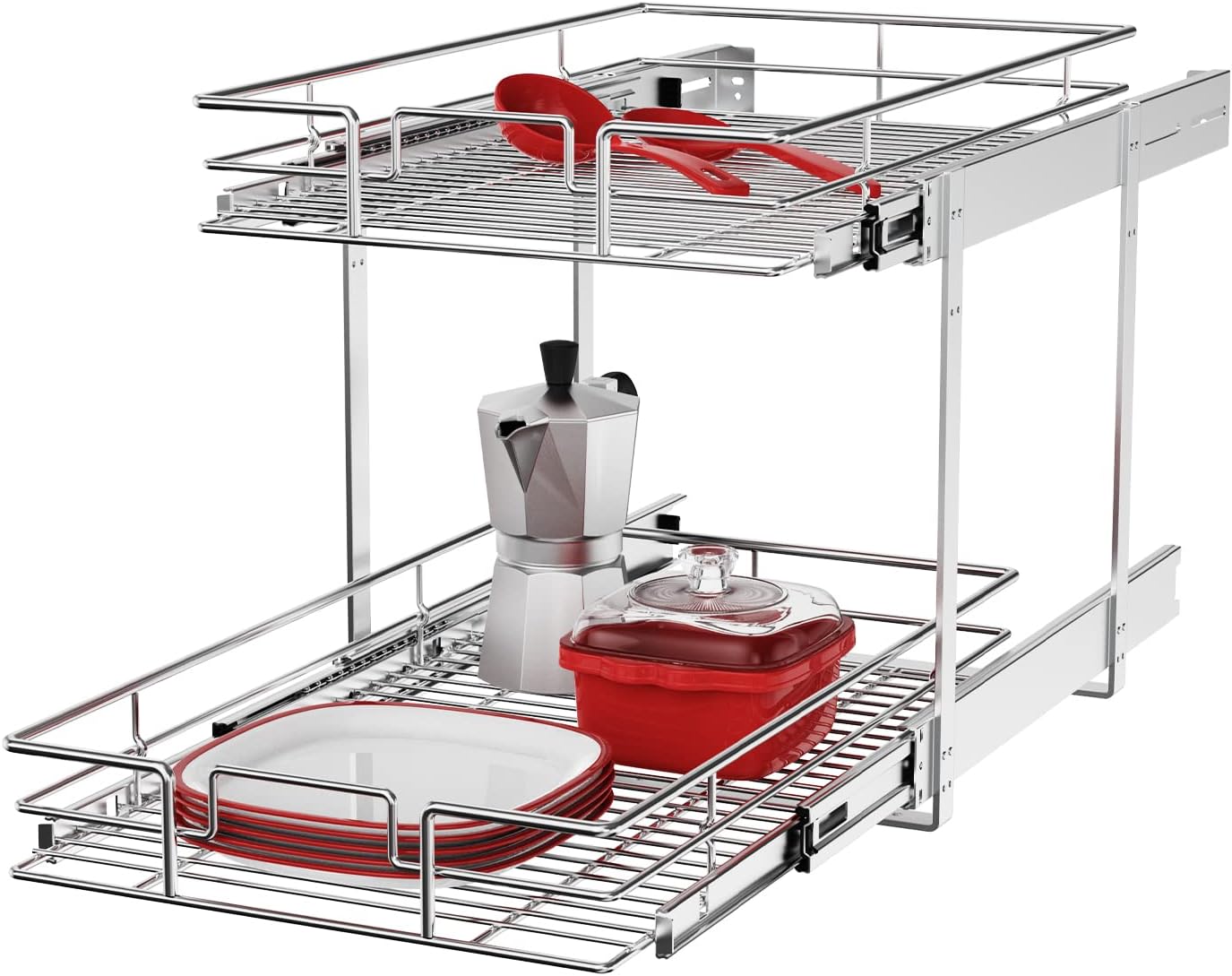 - 【Space-saving Pull Out Cabinet Organizer】This slide out cabinet organizer can maximize your cabinet space. Makes it super easy to store, organize, and access your stand mixers, pots, pans, baking sheets and other kitchen accessories, cleaning supplies, and various odds and ends. Now your cabinet is no longer just stacks of potspans.